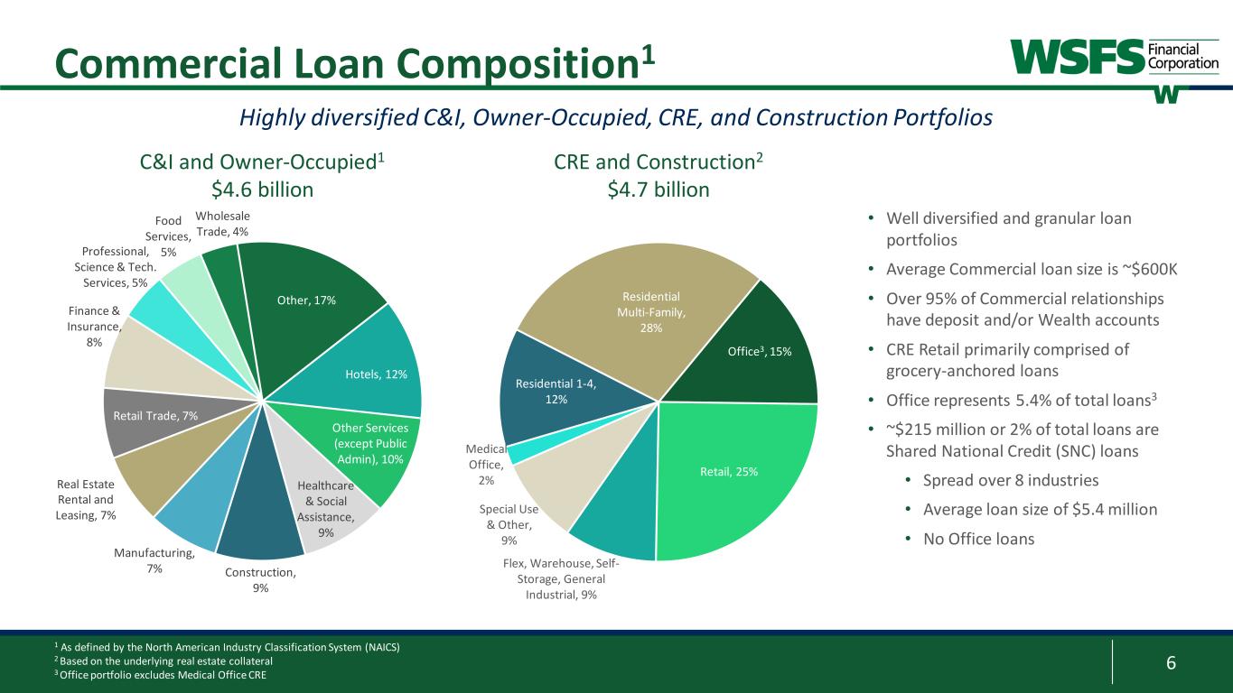 5 Loan Portfolio Trends • Commercial loan growth of $254 million or 3% (10% annualized) • Commercial line utilization of 38.3% • Consumer loan growth of $52 million driven by our Spring EQ partnership product (home equity loans) • Upstart portfolio declined $3 million to $232 million; ~2% of total gross loans Disciplined loan growth driven by Commercial segment Gross Loan Portfolio Composition 1 C&I loans includes Owner-Occupied C&I Loans Commercial Mortgages (CRE) Construction Loans Commercial Leases Residential Mortgage Traditional Consumer Consumer Partnerships 29% 36% 8% 5% 7% 6% 9% Commercial 78% Resi-Mortgage 7% Consumer Lending 15% ($ in millions) Sept 2023 Jun 2023 Sept 2022 3Q23 $ Growth Annualized % Growth C & I Loans1 $4,590 $4,533 $4,445 $57 5% Commercial Mortgages (CRE) 3,646 3,553 3,280 93 10% Construction Loans 1,043 955 1,028 88 37% Commercial Leases 606 590 535 16 11% Total Commercial Loans $9,885 $9,631 $9,288 $254 10% Residential Mortgage (HFS/HFI) 873 847 802 26 12% Consumer Loans 1,957 1,905 1,677 52 11% Total Gross Loans $12,715 $12,383 $11,767 $332 11% Loans - 3Q23 vs 2Q23 1