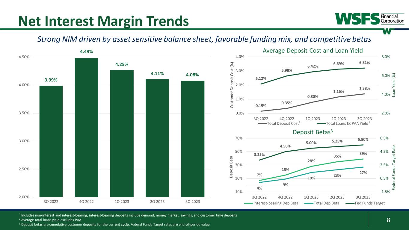 7 Investment Portfolio Long-term disciplined policies on Investment Portfolio concentrations, IRR, and Capital support optionality 1 Investment portfolio value includes market value AFS and book value of HTM 2 This is a non-GAAP financial measure and should be considered along with results prepared in accordance with GAAP, and not as a substitute for GAAP results. See Appendix for reconciliation to GAAP financial information • Allowing portfolio to run off to ~18% of total assets over time • Forecast cash flows of ~$1.0B over the next 24 months • Portfolio yield of 2.36%; funds being redeployed in higher yielding loans • Cashflows sufficient to fund loan growth of ~3.5% annualized • Investments are high quality, marketable investment grade securities • >95% in Agency MBS and Agency Notes Investments Investment Portfolio1 $4.76B % of Total Assets 24% AOCI ($780.7mm) Effective AOCI2,3 ($915.2mm) Portfolio Duration4 6.0yrs Portfolio Cashflow per yr. ~$500mm AFS Agency MBS Agency CMOs GNMA MBS/CMOs Agency Debent. HTM Agency MBS Munis $3.69B $1.07B $0.8 $0.7 $0.5 $0.0 $0.3 $0.5 $0.8 4Q23 2024 2025 Bi lli on s Projected AOCI Accretion5 AOCI Projected Runoff 3 Effective AOCI ($915.2mm) includes AFS, HTM, and HTM unrecognized MTM; reported AOCI of ($780.7mm) 4 Weighted average duration of the MBS portfolio 5 Projected AOCI accretion assumes a flat rate environment