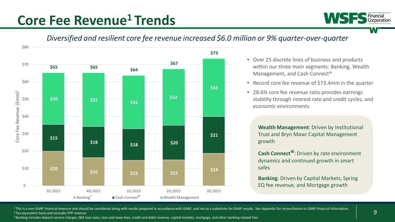 9 $20 $16 $15 $15 $19 $15 $18 $18 $20 $21 $30 $31 $31 $32 $33 $65 $65 $64 $67 $73 $- $10 $20 $30 $40 $50 $60 $70 $80 3Q 2022 4Q 2022 1Q 2023 2Q 2023 3Q 2023 Co re F ee R ev en ue ( $m m )2 Banking Cash Connect Wealth Management3 Core Fee Revenue1 Trends Diversified and resilient core fee revenue increased $6.0 million or 9% quarter-over-quarter 1 This is a non-GAAP financial measure and should be considered along with results prepared in accordance with GAAP, and not as a substitute for GAAP results. See Appendix for reconciliation to GAAP financial information. 2 Tax-equivalent basis and excludes PPP revenue 3 Banking includes deposit service charges, SBA loan sales, loan and lease fees, credit and debit revenue, capital markets, mortgage, and other banking related fees • Over 25 discrete lines of business and products within our three main segments: Banking, Wealth Management, and Cash Connect® • Record core fee revenue of $73.4mm in the quarter • 28.6% core fee revenue ratio provides earnings stability through interest rate and credit cycles, and economic environments Wealth Management: Driven by Institutional Trust and Bryn Mawr Capital Management growth Cash Connect®: Driven by rate environment dynamics and continued growth in smart safes Banking: Driven by Capital Markets, Spring EQ fee revenue, and Mortgage growth ®