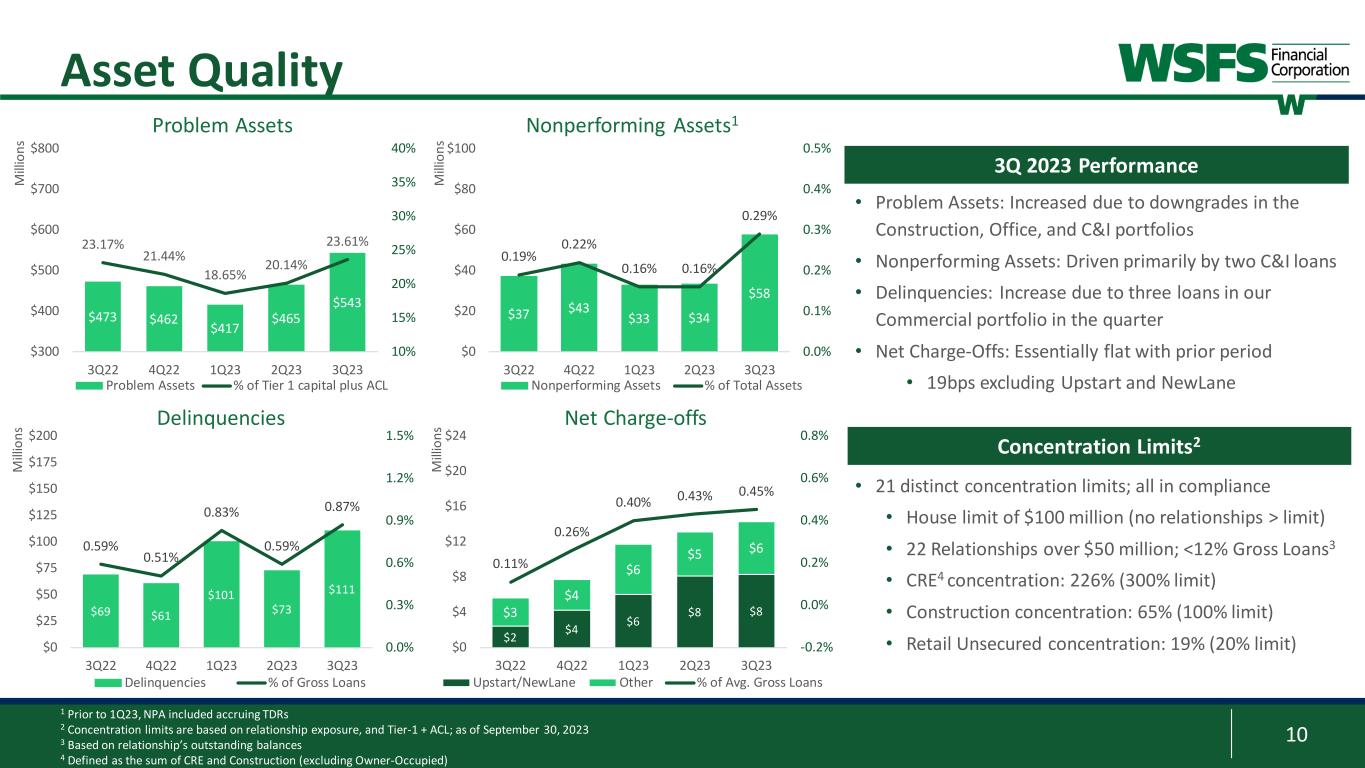 8 2.00% 2.50% 3.00% 3.50% 4.00% 4.50% 3Q 2022 4Q 2022 1Q 2023 2Q 2023 3Q 2023 0.15% 0.35% 0.80% 1.16% 1.38% 5.12% 5.98% 6.42% 6.69% 6.81% 2.0% 4.0% 6.0% 8.0% 0.0% 1.0% 2.0% 3.0% 4.0% 3Q 2022 4Q 2022 1Q 2023 2Q 2023 3Q 2023 Lo an Y ie ld (% ) Cu st om er D ep os it Co st (% ) Total Deposit Cost Total Loans Ex PAA Yield Deposit Betas3 Net Interest Margin Trends Strong NIM driven by asset sensitive balance sheet, favorable funding mix, and competitive betas Average Deposit Cost and Loan Yield 1 Includes non-interest and interest-bearing; interest-bearing deposits include demand, money market, savings, and customer time deposits 2 Average total loans yield excludes PAA 3 Deposit betas are cumulative customer deposits for the current cycle; Federal Funds Target rates are end-of-period value 21 3.99% 4.49% 4.25% 4.11% 4.08% 7% 15% 28% 35% 39% 4% 9% 19% 23% 27% 3.25% 4.50% 5.00% 5.25% 5.50% -1.5% 0.5% 2.5% 4.5% 6.5% -10% 10% 30% 50% 70% 3Q 2022 4Q 2022 1Q 2023 2Q 2023 3Q 2023 Fe de ra l F un ds T ar ge t R at e De po sit B et a Interest-bearing Dep Beta Total Dep Beta Fed Funds Target
