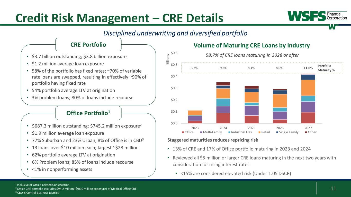 10 Asset Quality 1 Prior to 1Q23, NPA included accruing TDRs 2 Concentration limits are based on relationship exposure, and Tier-1 + ACL; as of September 30, 2023 3 Based on relationship’s outstanding balances 4 Defined as the sum of CRE and Construction (excluding Owner-Occupied) $473 $462 $417 $465 $543 23.17% 21.44% 18.65% 20.14% 23.61% 10% 15% 20% 25% 30% 35% 40% $300 $400 $500 $600 $700 $800 3Q22 4Q22 1Q23 2Q23 3Q23 M ill io ns Problem Assets % of Tier 1 capital plus ACL Problem Assets $37 $43 $33 $34 $58 0.19% 0.22% 0.16% 0.16% 0.29% 0.0% 0.1% 0.2% 0.3% 0.4% 0.5% $0 $20 $40 $60 $80 $100 3Q22 4Q22 1Q23 2Q23 3Q23 M ill io ns Nonperforming Assets % of Total Assets Nonperforming Assets1 $69 $61 $101 $73 $111 0.59% 0.51% 0.83% 0.59% 0.87% 0.0% 0.3% 0.6% 0.9% 1.2% 1.5% $0 $25 $50 $75 $100 $125 $150 $175 $200 3Q22 4Q22 1Q23 2Q23 3Q23 M ill io ns Delinquencies % of Gross Loans Delinquencies $2 $4 $6 $8 $8$3 $4 $6 $5 $6 0.11% 0.26% 0.40% 0.43% 0.45% -0.2% 0.0% 0.2% 0.4% 0.6% 0.8% $0 $4 $8 $12 $16 $20 $24 3Q22 4Q22 1Q23 2Q23 3Q23 M ill io ns Upstart/NewLane Other % of Avg. Gross Loans Net Charge-offs • Problem Assets: Increased due to downgrades in the Construction, Office, and C&I portfolios • Nonperforming Assets: Driven primarily by two C&I loans • Delinquencies: Increase due to three loans in our Commercial portfolio in the quarter • Net Charge-Offs: Essentially flat with prior period • 19bps excluding Upstart and NewLane 3Q 2023 Performance • 21 distinct concentration limits; all in compliance • House limit of $100 million (no relationships > limit) • 22 Relationships over $50 million; <12% Gross Loans3 • CRE4 concentration: 226% (300% limit) • Construction concentration: 65% (100% limit) • Retail Unsecured concentration: 19% (20% limit) Concentration Limits2