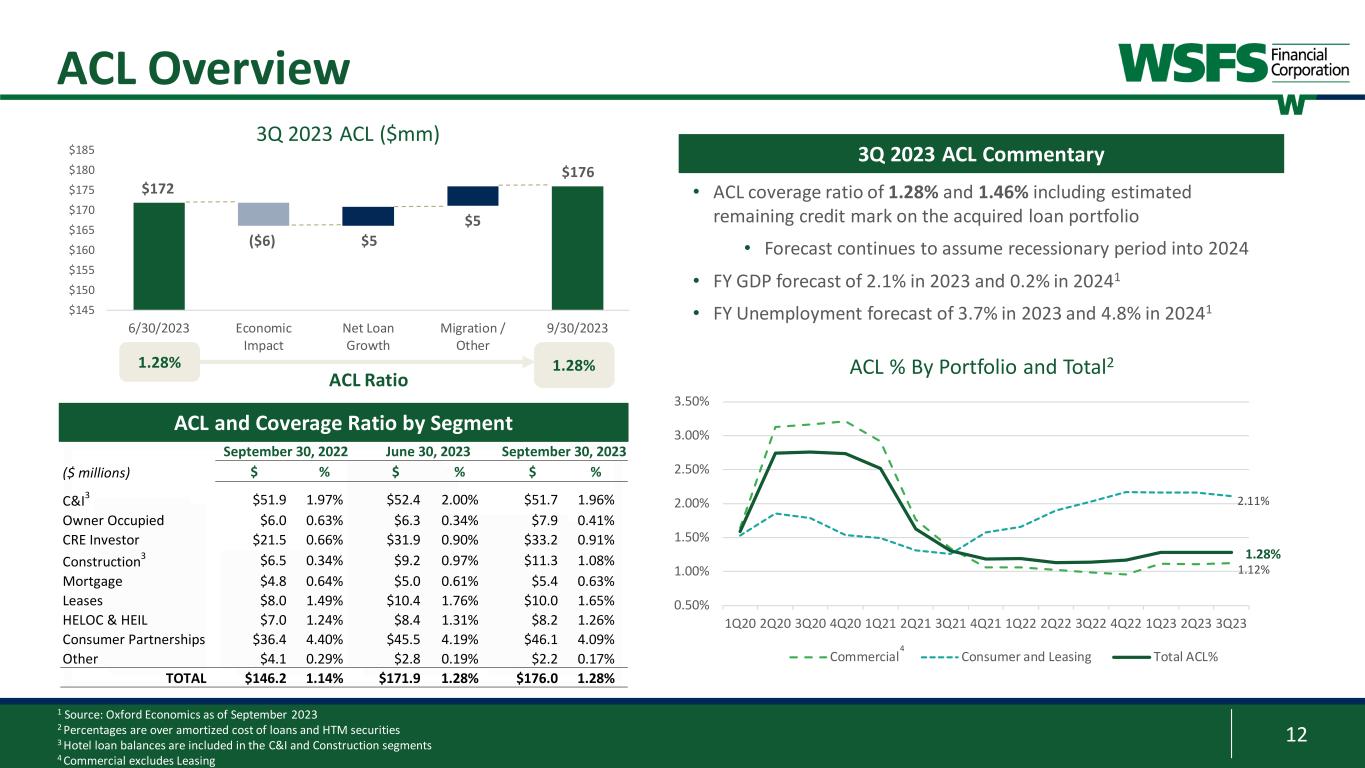 11 $0.0 $0.1 $0.2 $0.3 $0.4 $0.5 $0.6 2023 2024 2025 2026 2027 Bi lli on s Volume of Maturing CRE Loans by Industry Office Multi-Family Industrial Flex Retail Single Family Other 3.3% 9.6% 8.7% 8.0% 11.6% Credit Risk Management – CRE Details • $3.7 billion outstanding; $3.8 billion exposure • $1.2 million average loan exposure • 58% of the portfolio has fixed rates; ~70% of variable rate loans are swapped, resulting in effectively ~90% of portfolio having fixed rate • 54% portfolio average LTV at origination • 3% problem loans; 80% of loans include recourse CRE Portfolio 1 Inclusive of Office-related Construction 2 Office CRE portfolio excludes $94.2 million ($96.0 million exposure) of Medical Office CRE 3 CBD is Central Business District Disciplined underwriting and diversified portfolio Staggered maturities reduces repricing risk • 13% of CRE and 17% of Office portfolio maturing in 2023 and 2024 • Reviewed all $5 million or larger CRE loans maturing in the next two years with consideration for rising interest rates • <15% are considered elevated risk (Under 1.05 DSCR) • $687.3 million outstanding; $745.2 million exposure2 • $1.9 million average loan exposure • 77% Suburban and 23% Urban; 8% of Office is in CBD3 • 13 loans over $10 million each; largest ~$28 million • 62% portfolio average LTV at origination • 6% Problem loans; 85% of loans include recourse • <1% in nonperforming assets Office Portfolio1 58.7% of CRE loans maturing in 2028 or after Portfolio Maturity %