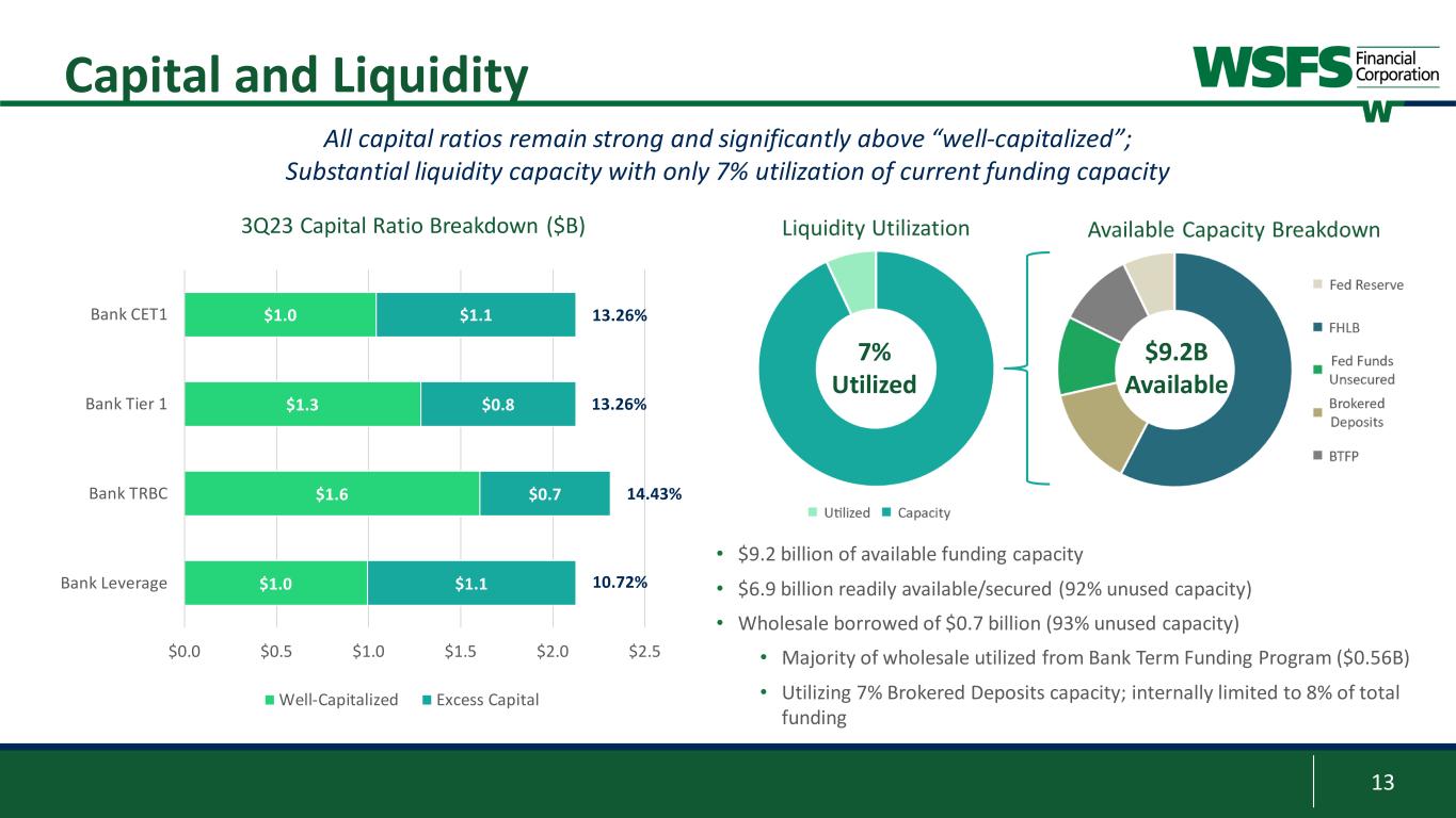 12 ACL Ratio $145 $150 $155 $160 $165 $170 $175 $180 $185 6/30/2023 Economic Impact Net Loan Growth Migration / Other 9/30/2023 3Q 2023 ACL ($mm) ($6) $172 $5 $176 $5 1 Source: Oxford Economics as of September 2023 2 Percentages are over amortized cost of loans and HTM securities 3 Hotel loan balances are included in the C&I and Construction segments 4 Commercial excludes Leasing ACL Overview ACL and Coverage Ratio by Segment 3Q 2023 ACL Commentary 1.28% • ACL coverage ratio of 1.28% and 1.46% including estimated remaining credit mark on the acquired loan portfolio • Forecast continues to assume recessionary period into 2024 • FY GDP forecast of 2.1% in 2023 and 0.2% in 20241 • FY Unemployment forecast of 3.7% in 2023 and 4.8% in 20241 1.28% 1.12% 2.11% 1.28% 0.50% 1.00% 1.50% 2.00% 2.50% 3.00% 3.50% 1Q20 2Q20 3Q20 4Q20 1Q21 2Q21 3Q21 4Q21 1Q22 2Q22 3Q22 4Q22 1Q23 2Q23 3Q23 ACL % By Portfolio and Total2 Commercial Consumer and Leasing Total ACL% 4 ($ millions) $ % $ % $ % C&I3 $51.9 1.97% $52.4 2.00% $51.7 1.96% Owner Occupied $6.0 0.63% $6.3 0.34% $7.9 0.41% CRE Investor $21.5 0.66% $31.9 0.90% $33.2 0.91% Construction3 $6.5 0.34% $9.2 0.97% $11.3 1.08% Mortgage $4.8 0.64% $5.0 0.61% $5.4 0.63% Leases $8.0 1.49% $10.4 1.76% $10.0 1.65% HELOC & HEIL $7.0 1.24% $8.4 1.31% $8.2 1.26% Consumer Partnerships $36.4 4.40% $45.5 4.19% $46.1 4.09% Other $4.1 0.29% $2.8 0.19% $2.2 0.17% TOTAL $146.2 1.14% $171.9 1.28% $176.0 1.28% September 30, 2022 June 30, 2023 September 30, 2023