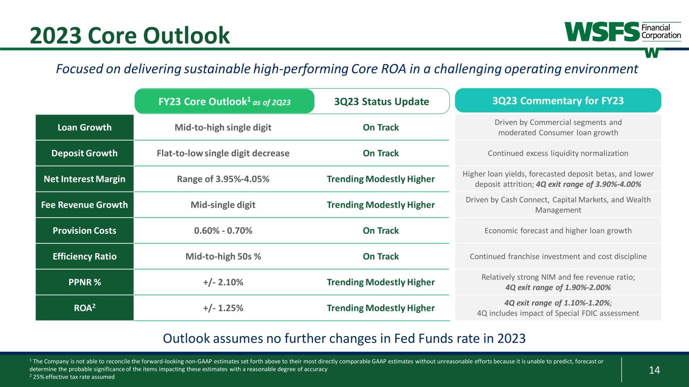 13 Capital and Liquidity All capital ratios remain strong and significantly above “well-capitalized”; Substantial liquidity capacity with only 7% utilization of current funding capacity • $9.2 billion of available funding capacity • $6.9 billion readily available/secured (92% unused capacity) • Wholesale borrowed of $0.7 billion (93% unused capacity) • Majority of wholesale utilized from Bank Term Funding Program ($0.56B) • Utilizing 7% Brokered Deposits capacity; internally limited to 8% of total funding 7% Utilized $9.2B Available $1.0 $1.6 $1.3 $1.0 $1.1 $0.7 $0.8 $1.1 $0.0 $0.5 $1.0 $1.5 $2.0 $2.5 Bank Leverage Bank TRBC Bank Tier 1 Bank CET1 Well-Capitalized Excess Capital 3Q23 Capital Ratio Breakdown ($B) 10.72% 14.43% 13.26% 13.26%