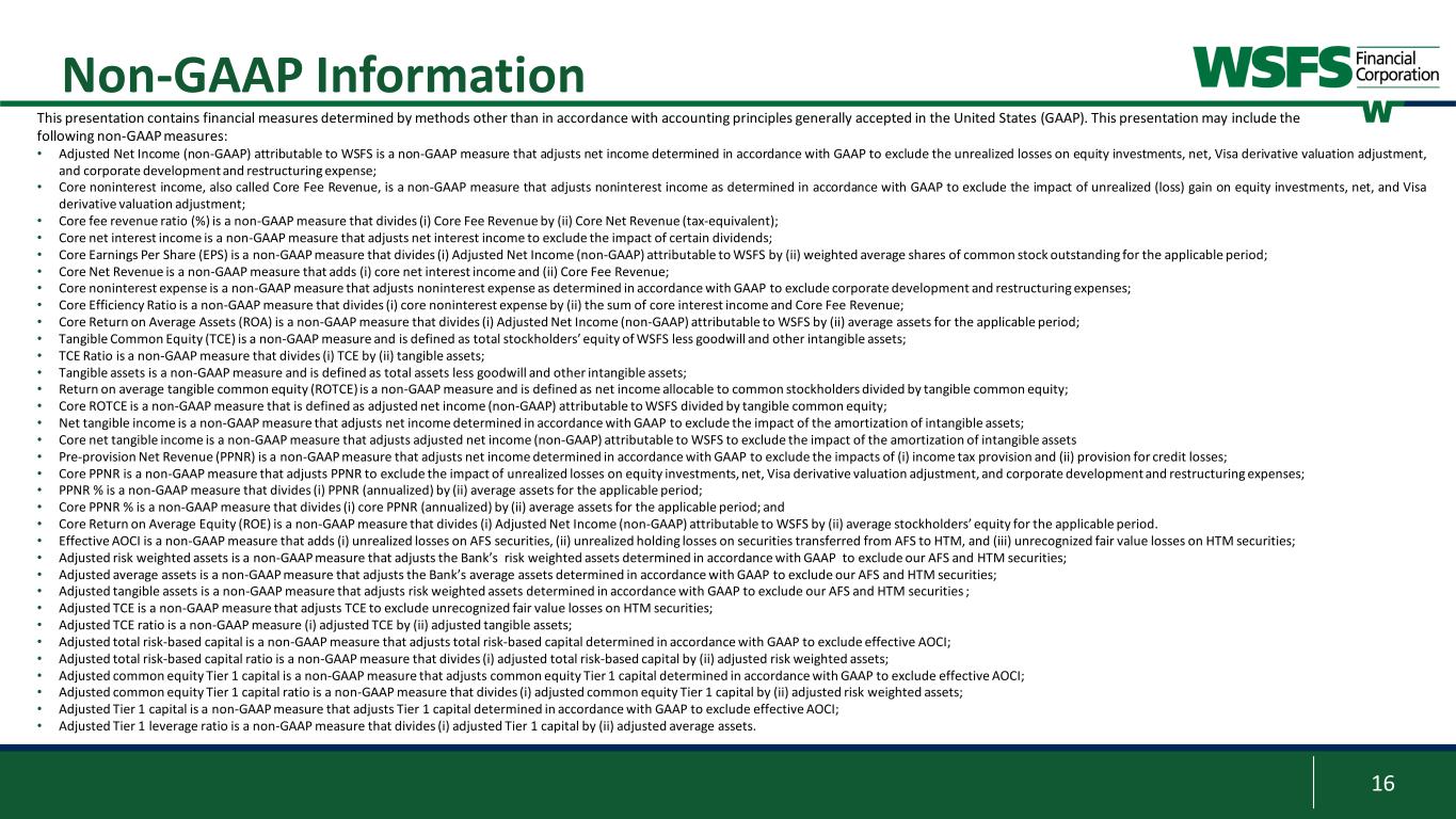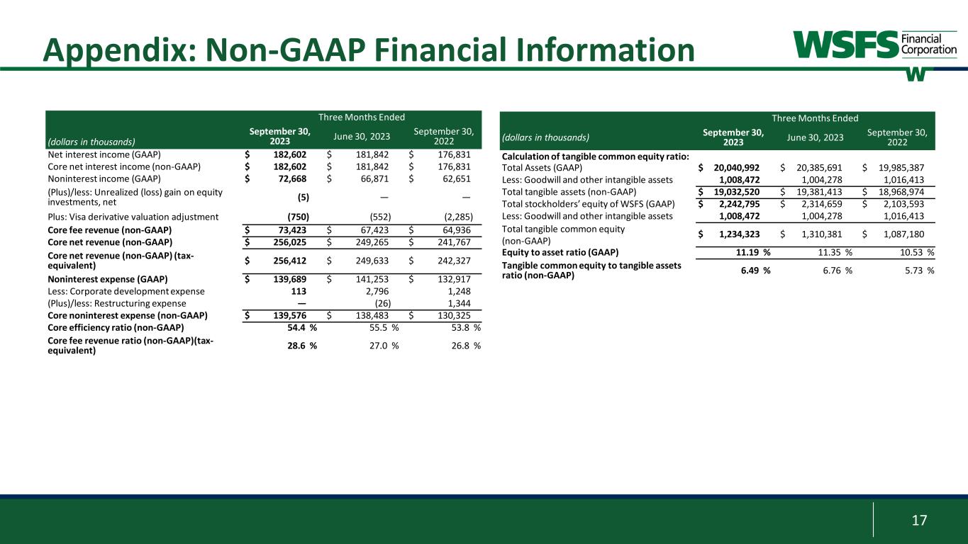 16 Non-GAAP Information This presentation contains financial measures determined by methods other than in accordance with accounting principles generally accepted in the United States (GAAP). This presentation may include the following non-GAAP measures: • Adjusted Net Income (non-GAAP) attributable to WSFS is a non-GAAP measure that adjusts net income determined in accordance with GAAP to exclude the unrealized losses on equity investments, net, Visa derivative valuation adjustment, and corporate development and restructuring expense; • Core noninterest income, also called Core Fee Revenue, is a non-GAAP measure that adjusts noninterest income as determined in accordance with GAAP to exclude the impact of unrealized (loss) gain on equity investments, net, and Visa derivative valuation adjustment; • Core fee revenue ratio (%) is a non-GAAP measure that divides (i) Core Fee Revenue by (ii) Core Net Revenue (tax-equivalent); • Core net interest income is a non-GAAP measure that adjusts net interest income to exclude the impact of certain dividends; • Core Earnings Per Share (EPS) is a non-GAAP measure that divides (i) Adjusted Net Income (non-GAAP) attributable to WSFS by (ii) weighted average shares of common stock outstanding for the applicable period; • Core Net Revenue is a non-GAAP measure that adds (i) core net interest income and (ii) Core Fee Revenue; • Core noninterest expense is a non-GAAP measure that adjusts noninterest expense as determined in accordance with GAAP to exclude corporate development and restructuring expenses; • Core Efficiency Ratio is a non-GAAP measure that divides (i) core noninterest expense by (ii) the sum of core interest income and Core Fee Revenue; • Core Return on Average Assets (ROA) is a non-GAAP measure that divides (i) Adjusted Net Income (non-GAAP) attributable to WSFS by (ii) average assets for the applicable period; • Tangible Common Equity (TCE) is a non-GAAP measure and is defined as total stockholders’ equity of WSFS less goodwill and other intangible assets; • TCE Ratio is a non-GAAP measure that divides (i) TCE by (ii) tangible assets; • Tangible assets is a non-GAAP measure and is defined as total assets less goodwill and other intangible assets; • Return on average tangible common equity (ROTCE) is a non-GAAP measure and is defined as net income allocable to common stockholders divided by tangible common equity; • Core ROTCE is a non-GAAP measure that is defined as adjusted net income (non-GAAP) attributable to WSFS divided by tangible common equity; • Net tangible income is a non-GAAP measure that adjusts net income determined in accordance with GAAP to exclude the impact of the amortization of intangible assets; • Core net tangible income is a non-GAAP measure that adjusts adjusted net income (non-GAAP) attributable to WSFS to exclude the impact of the amortization of intangible assets • Pre-provision Net Revenue (PPNR) is a non-GAAP measure that adjusts net income determined in accordance with GAAP to exclude the impacts of (i) income tax provision and (ii) provision for credit losses; • Core PPNR is a non-GAAP measure that adjusts PPNR to exclude the impact of unrealized losses on equity investments, net, Visa derivative valuation adjustment, and corporate development and restructuring expenses; • PPNR % is a non-GAAP measure that divides (i) PPNR (annualized) by (ii) average assets for the applicable period; • Core PPNR % is a non-GAAP measure that divides (i) core PPNR (annualized) by (ii) average assets for the applicable period; and • Core Return on Average Equity (ROE) is a non-GAAP measure that divides (i) Adjusted Net Income (non-GAAP) attributable to WSFS by (ii) average stockholders’ equity for the applicable period. • Effective AOCI is a non-GAAP measure that adds (i) unrealized losses on AFS securities, (ii) unrealized holding losses on securities transferred from AFS to HTM, and (iii) unrecognized fair value losses on HTM securities; • Adjusted risk weighted assets is a non-GAAP measure that adjusts the Bank’s risk weighted assets determined in accordance with GAAP to exclude our AFS and HTM securities; • Adjusted average assets is a non-GAAP measure that adjusts the Bank’s average assets determined in accordance with GAAP to exclude our AFS and HTM securities; • Adjusted tangible assets is a non-GAAP measure that adjusts risk weighted assets determined in accordance with GAAP to exclude our AFS and HTM securities ; • Adjusted TCE is a non-GAAP measure that adjusts TCE to exclude unrecognized fair value losses on HTM securities; • Adjusted TCE ratio is a non-GAAP measure (i) adjusted TCE by (ii) adjusted tangible assets; • Adjusted total risk-based capital is a non-GAAP measure that adjusts total risk-based capital determined in accordance with GAAP to exclude effective AOCI; • Adjusted total risk-based capital ratio is a non-GAAP measure that divides (i) adjusted total risk-based capital by (ii) adjusted risk weighted assets; • Adjusted common equity Tier 1 capital is a non-GAAP measure that adjusts common equity Tier 1 capital determined in accordance with GAAP to exclude effective AOCI; • Adjusted common equity Tier 1 capital ratio is a non-GAAP measure that divides (i) adjusted common equity Tier 1 capital by (ii) adjusted risk weighted assets; • Adjusted Tier 1 capital is a non-GAAP measure that adjusts Tier 1 capital determined in accordance with GAAP to exclude effective AOCI; • Adjusted Tier 1 leverage ratio is a non-GAAP measure that divides (i) adjusted Tier 1 capital by (ii) adjusted average assets.