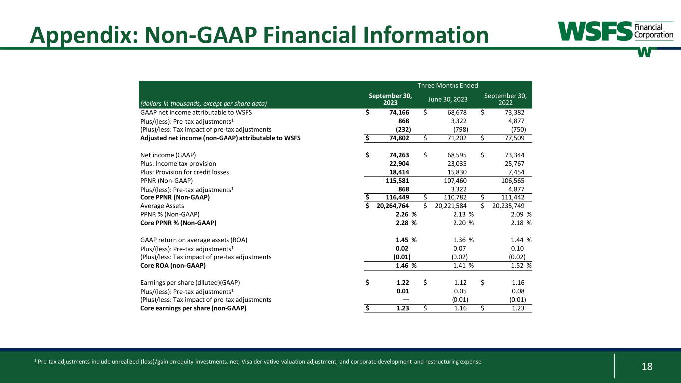 17 Appendix: Non-GAAP Financial Information Three Months Ended (dollars in thousands) September 30, 2023 June 30, 2023 September 30, 2022 Net interest income (GAAP) $ 182,602 $ 181,842 $ 176,831 Core net interest income (non-GAAP) $ 182,602 $ 181,842 $ 176,831 Noninterest income (GAAP) $ 72,668 $ 66,871 $ 62,651 (Plus)/less: Unrealized (loss) gain on equity investments, net (5) — — Plus: Visa derivative valuation adjustment (750) (552) (2,285) Core fee revenue (non-GAAP) $ 73,423 $ 67,423 $ 64,936 Core net revenue (non-GAAP) $ 256,025 $ 249,265 $ 241,767 Core net revenue (non-GAAP) (tax- equivalent) $ 256,412 $ 249,633 $ 242,327 Noninterest expense (GAAP) $ 139,689 $ 141,253 $ 132,917 Less: Corporate development expense 113 2,796 1,248 (Plus)/less: Restructuring expense — (26) 1,344 Core noninterest expense (non-GAAP) $ 139,576 $ 138,483 $ 130,325 Core efficiency ratio (non-GAAP) 54.4 % 55.5 % 53.8 % Core fee revenue ratio (non-GAAP)(tax- equivalent) 28.6 % 27.0 % 26.8 % Three Months Ended (dollars in thousands) September 30, 2023 June 30, 2023 September 30, 2022 Calculation of tangible common equity ratio: Total Assets (GAAP) $ 20,040,992 $ 20,385,691 $ 19,985,387 Less: Goodwill and other intangible assets 1,008,472 1,004,278 1,016,413 Total tangible assets (non-GAAP) $ 19,032,520 $ 19,381,413 $ 18,968,974 Total stockholders’ equity of WSFS (GAAP) $ 2,242,795 $ 2,314,659 $ 2,103,593 Less: Goodwill and other intangible assets 1,008,472 1,004,278 1,016,413 Total tangible common equity (non-GAAP) $ 1,234,323 $ 1,310,381 $ 1,087,180 Equity to asset ratio (GAAP) 11.19 % 11.35 % 10.53 % Tangible common equity to tangible assets ratio (non-GAAP) 6.49 % 6.76 % 5.73 %