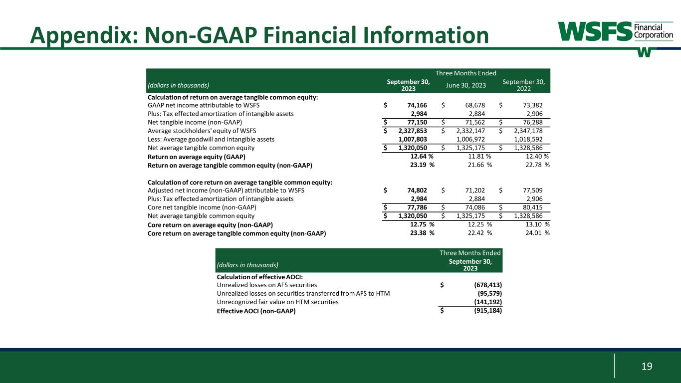 18 Appendix: Non-GAAP Financial Information Three Months Ended (dollars in thousands, except per share data) September 30, 2023 June 30, 2023 September 30, 2022 GAAP net income attributable to WSFS $ 74,166 $ 68,678 $ 73,382 Plus/(less): Pre-tax adjustments1 868 3,322 4,877 (Plus)/less: Tax impact of pre-tax adjustments (232) (798) (750) Adjusted net income (non-GAAP) attributable to WSFS $ 74,802 $ 71,202 $ 77,509 Net income (GAAP) $ 74,263 $ 68,595 $ 73,344 Plus: Income tax provision 22,904 23,035 25,767 Plus: Provision for credit losses 18,414 15,830 7,454 PPNR (Non-GAAP) 115,581 107,460 106,565 Plus/(less): Pre-tax adjustments1 868 3,322 4,877 Core PPNR (Non-GAAP) $ 116,449 $ 110,782 $ 111,442 Average Assets $ 20,264,764 $ 20,221,584 $ 20,235,749 PPNR % (Non-GAAP) 2.26 % 2.13 % 2.09 % Core PPNR % (Non-GAAP) 2.28 % 2.20 % 2.18 % GAAP return on average assets (ROA) 1.45 % 1.36 % 1.44 % Plus/(less): Pre-tax adjustments1 0.02 0.07 0.10 (Plus)/less: Tax impact of pre-tax adjustments (0.01) (0.02) (0.02) Core ROA (non-GAAP) 1.46 % 1.41 % 1.52 % Earnings per share (diluted)(GAAP) $ 1.22 $ 1.12 $ 1.16 Plus/(less): Pre-tax adjustments1 0.01 0.05 0.08 (Plus)/less: Tax impact of pre-tax adjustments — (0.01) (0.01) Core earnings per share (non-GAAP) $ 1.23 $ 1.16 $ 1.23 1 Pre-tax adjustments include unrealized (loss)/gain on equity investments, net, Visa derivative valuation adjustment, and corporate development and restructuring expense