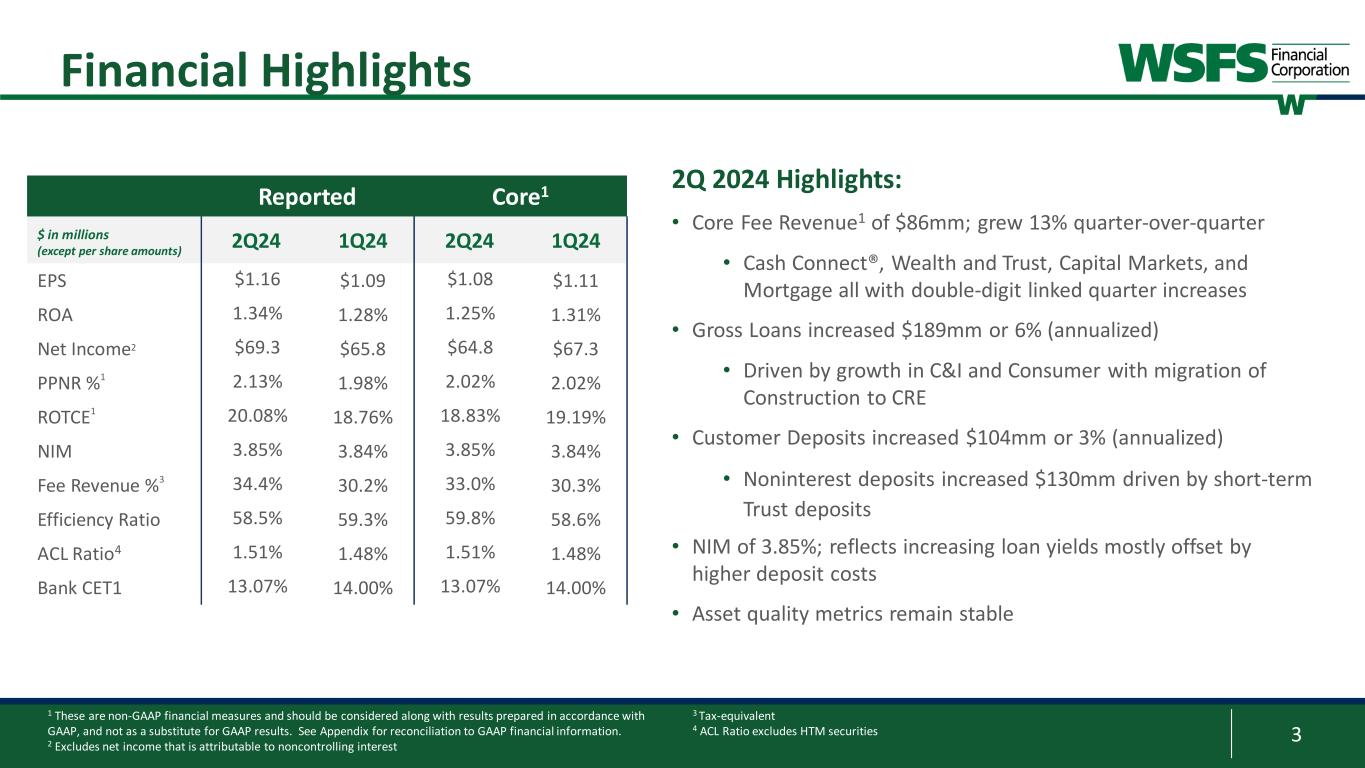 2 Forward Looking Statements & Non-GAAP Forward Looking Statements: This presentation contains estimates, predictions, opinions, projections and other "forward-looking statements" as that phrase is defined in the Private Securities Litigation Reform Act of 1995. Such statements include, without limitation, references to the Company's predictions or expectations of future business or financial performance as well as its goals and objectives for future operations, financial and business trends, business prospects, and management's outlook or expectations for earnings, revenues, expenses, capital levels, liquidity levels, asset quality or other future financial or business performance, strategies or expectations. The words “believe,” “expect,” “anticipate,” “plan,” “estimate,” “target,” “project” and similar expressions, among others, generally identify forward- looking statements. Such forward-looking statements are based on various assumptions (some of which may be beyond the Company's control) and are subject to significant risks and uncertainties (which change over time) and other factors, including the impacts related to or resulting from bank failures and other economic and industry volatility, including potential increased regulatory requirements and costs and potential impacts to macroeconomic conditions, the uncertain effects of geopolitical instability, armed conflicts, public health crises, inflation, interest rates and actions taken in response thereto on our business, results of operations, capital and liquidity, which could cause actual results to differ materially from those currently anticipated. Such risks and uncertainties are discussed in detail in the Company’s Form 10-K for the year ended December 31, 2023, and Form 10-Q for the quarter ended March 31, 2024, and other documents filed by the Company with the Securities and Exchange Commission from time to time. We caution readers not to place undue reliance on any such forward-looking statements, which speak only as of the date on which they are made, and the Company disclaims any duty to revise or update any forward-looking statement, whether written or oral, that may be made from time to time by or on behalf of the Company for any reason, except as specifically required by law. As used in this presentation, the terms "WSFS", "the Company", "registrant", "we", "us", and "our" mean WSFS Financial Corporation and its subsidiaries, on a consolidated basis, unless the context indicates otherwise. Non-GAAP Financial Measures: This presentation contains financial measures determined by methods other than in accordance with accounting principles generally accepted in the United States (“GAAP”). These non-GAAP measures include Core Earnings Per Share (“EPS”), Core Net Income, Core Efficiency ratio, Pre-provision Net Revenue (“PPNR”), Core PPNR, PPNR to average assets ratio, Core PPNR to average assets ratio, Core Return on Assets (“ROA”), core net interest income, Core Net Interest Margin (“NIM”), Tangible Common Equity (“TCE”), tangible assets, Return on Tangible Common Equity (“ROTCE”), Core ROTCE, Core Fee Revenue, Core Fee Revenue ratio, net tangible income, tangible common book value (“TBV”), TBV excluding AOCI, coverage ratio including the remaining credit marks, and Effective AOCI. The Company’s management believes that these non-GAAP measures provide a greater understanding of ongoing operations, enhance comparability of results of operations with prior periods and show the effects of significant gains and charges in the periods presented. The Company’s management believes that investors may use these non-GAAP measures to analyze the Company’s financial performance without the impact of unusual items or events that may obscure trends in the Company’s underlying performance. This non-GAAP data should be considered in addition to results prepared in accordance with GAAP, and is not a substitute for, or superior to, GAAP results. For a reconciliation of these non-GAAP measures to their comparable GAAP measures, see the Appendix. Trade names, trademarks and service marks of other companies appearing in this presentation are the property of their respective holders.