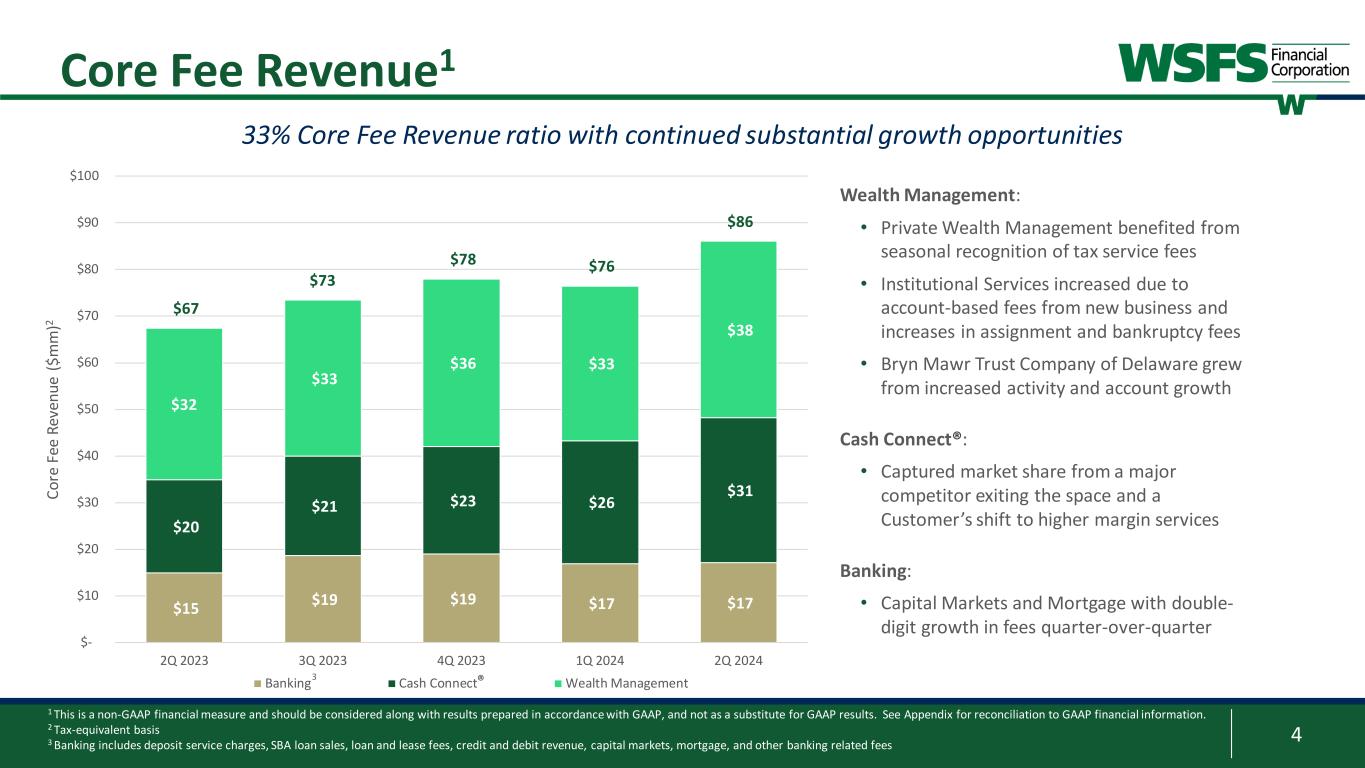 3 Financial Highlights 2Q 2024 Highlights: • Core Fee Revenue1 of $86mm; grew 13% quarter-over-quarter • Cash Connect®, Wealth and Trust, Capital Markets, and Mortgage all with double-digit linked quarter increases • Gross Loans increased $189mm or 6% (annualized) • Driven by growth in C&I and Consumer with migration of Construction to CRE • Customer Deposits increased $104mm or 3% (annualized) • Noninterest deposits increased $130mm driven by short-term Trust deposits • NIM of 3.85%; reflects increasing loan yields mostly offset by higher deposit costs • Asset quality metrics remain stable 1 These are non-GAAP financial measures and should be considered along with results prepared in accordance with GAAP, and not as a substitute for GAAP results. See Appendix for reconciliation to GAAP financial information. 2 Excludes net income that is attributable to noncontrolling interest Reported Core1 $ in millions (except per share amounts) 2Q24 1Q24 2Q24 1Q24 EPS $1.16 $1.09 $1.08 $1.11 ROA 1.34% 1.28% 1.25% 1.31% Net Income2 $69.3 $65.8 $64.8 $67.3 PPNR %1 2.13% 1.98% 2.02% 2.02% ROTCE1 20.08% 18.76% 18.83% 19.19% NIM 3.85% 3.84% 3.85% 3.84% Fee Revenue %3 34.4% 30.2% 33.0% 30.3% Efficiency Ratio 58.5% 59.3% 59.8% 58.6% ACL Ratio4 1.51% 1.48% 1.51% 1.48% Bank CET1 13.07% 14.00% 13.07% 14.00% 3 Tax-equivalent 4 ACL Ratio excludes HTM securities