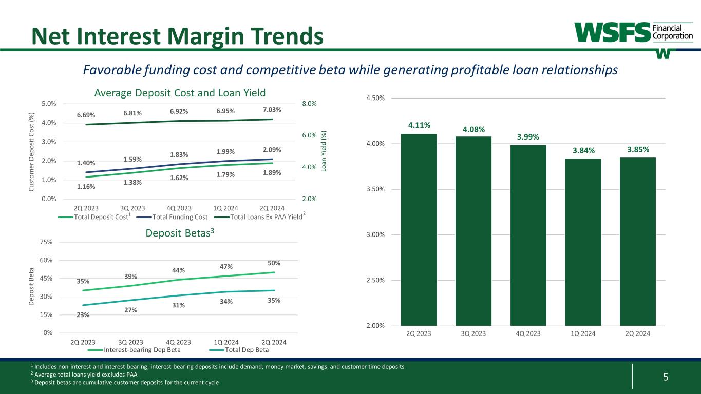 4 $15 $19 $19 $17 $17 $20 $21 $23 $26 $31 $32 $33 $36 $33 $38 $67 $73 $78 $76 $86 $- $10 $20 $30 $40 $50 $60 $70 $80 $90 $100 2Q 2023 3Q 2023 4Q 2023 1Q 2024 2Q 2024 Co re F ee R ev en ue ( $m m )2 Banking Cash Connect Wealth Management3 Core Fee Revenue1 33% Core Fee Revenue ratio with continued substantial growth opportunities 1 This is a non-GAAP financial measure and should be considered along with results prepared in accordance with GAAP, and not as a substitute for GAAP results. See Appendix for reconciliation to GAAP financial information. 2 Tax-equivalent basis 3 Banking includes deposit service charges, SBA loan sales, loan and lease fees, credit and debit revenue, capital markets, mortgage, and other banking related fees Wealth Management: • Private Wealth Management benefited from seasonal recognition of tax service fees • Institutional Services increased due to account-based fees from new business and increases in assignment and bankruptcy fees • Bryn Mawr Trust Company of Delaware grew from increased activity and account growth Cash Connect®: • Captured market share from a major competitor exiting the space and a Customer’s shift to higher margin services Banking: • Capital Markets and Mortgage with double- digit growth in fees quarter-over-quarter ®