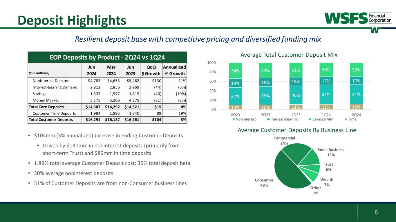 5 2.00% 2.50% 3.00% 3.50% 4.00% 4.50% 2Q 2023 3Q 2023 4Q 2023 1Q 2024 2Q 2024 1.16% 1.38% 1.62% 1.79% 1.89% 1.40% 1.59% 1.83% 1.99% 2.09% 6.69% 6.81% 6.92% 6.95% 7.03% 2.0% 4.0% 6.0% 8.0% 0.0% 1.0% 2.0% 3.0% 4.0% 5.0% 2Q 2023 3Q 2023 4Q 2023 1Q 2024 2Q 2024 Lo an Y ie ld (% ) Cu st om er D ep os it Co st (% ) Total Deposit Cost Total Funding Cost Total Loans Ex PAA Yield Deposit Betas3 Net Interest Margin Trends Favorable funding cost and competitive beta while generating profitable loan relationships Average Deposit Cost and Loan Yield 1 Includes non-interest and interest-bearing; interest-bearing deposits include demand, money market, savings, and customer time deposits 2 Average total loans yield excludes PAA 3 Deposit betas are cumulative customer deposits for the current cycle 21 4.11% 4.08% 3.99% 3.84% 35% 39% 44% 47% 50% 23% 27% 31% 34% 35% 0% 15% 30% 45% 60% 75% 2Q 2023 3Q 2023 4Q 2023 1Q 2024 2Q 2024 De po sit B et a Interest-bearing Dep Beta Total Dep Beta 3.85%