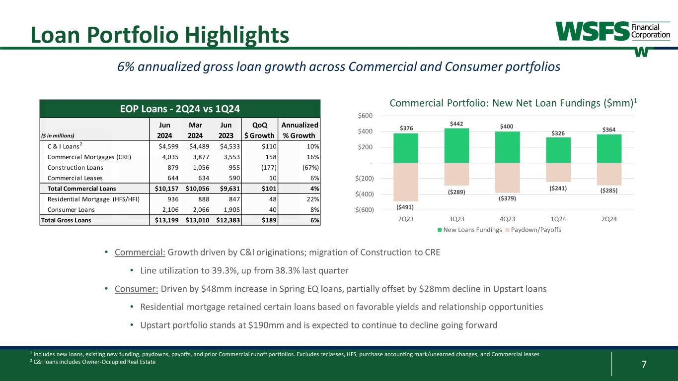 6 Deposit Highlights • $104mm (3% annualized) increase in ending Customer Deposits • Driven by $130mm in noninterest deposits (primarily from short-term Trust) and $89mm in time deposits • 1.89% total average Customer Deposit cost; 35% total deposit beta • 30% average noninterest deposits • 51% of Customer Deposits are from non-Consumer business lines Resilient deposit base with competitive pricing and diversified funding mix Average Total Customer Deposit Mix 10% 10% 11% 11% 12% 37% 39% 40% 42% 41% 19% 18% 18% 17% 17% 34% 33% 31% 30% 30% 0% 20% 40% 60% 80% 100% 2Q23 3Q23 4Q23 1Q24 2Q24 Noninterest Interest-bearing Savings/MM Time ($ in millions) Jun 2024 Mar 2024 Jun 2023 QoQ $ Growth Annualized % Growth Noninterest Demand $4,783 $4,653 $5,462 $130 11% Interest-bearing Demand 2,812 2,856 2,969 (44) (6%) Savings 1,537 1,577 1,815 (40) (10%) Money Market 5,175 5,206 4,375 (31) (2%) Total Core Deposits $14,307 $14,292 $14,621 $15 0% Customer Time Deposits 1,984 1,895 1,640 89 19% Total Customer Deposits $16,291 $16,187 $16,261 $104 3% EOP Deposits by Product - 2Q24 vs 1Q24 Consumer 49% Commercial 24% Small Business 13% Trust 6% Wealth 7% Other 1% Average Customer Deposits By Business Line