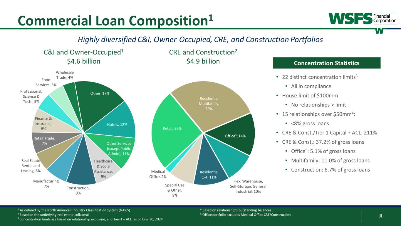 7 Loan Portfolio Highlights • Commercial: Growth driven by C&I originations; migration of Construction to CRE • Line utilization to 39.3%, up from 38.3% last quarter • Consumer: Driven by $48mm increase in Spring EQ loans, partially offset by $28mm decline in Upstart loans • Residential mortgage retained certain loans based on favorable yields and relationship opportunities • Upstart portfolio stands at $190mm and is expected to continue to decline going forward 6% annualized gross loan growth across Commercial and Consumer portfolios 1 Includes new loans, existing new funding, paydowns, payoffs, and prior Commercial runoff portfolios. Excludes reclasses, HFS, purchase accounting mark/unearned changes, and Commercial leases 2 C&I loans includes Owner-Occupied Real Estate $376 $442 $400 $326 $364 ($491) ($289) ($379) ($241) ($285) $(600) $(400) $(200) - $200 $400 $600 2Q23 3Q23 4Q23 1Q24 2Q24 New Loans Fundings Paydown/Payoffs Commercial Portfolio: New Net Loan Fundings ($mm)1 ($ in millions) Jun 2024 Mar 2024 Jun 2023 QoQ $ Growth Annualized % Growth C & I Loans2 $4,599 $4,489 $4,533 $110 10% Commercial Mortgages (CRE) 4,035 3,877 3,553 158 16% Construction Loans 879 1,056 955 (177) (67%) Commercial Leases 644 634 590 10 6% Total Commercial Loans $10,157 $10,056 $9,631 $101 4% Residential Mortgage (HFS/HFI) 936 888 847 48 22% Consumer Loans 2,106 2,066 1,905 40 8% Total Gross Loans $13,199 $13,010 $12,383 $189 6% EOP Loans - 2Q24 vs 1Q24