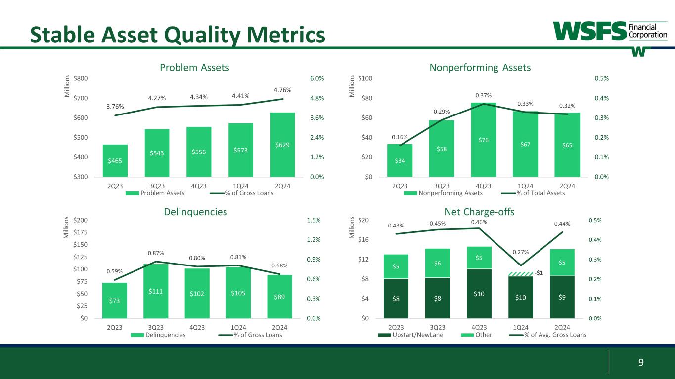 8 3 Commercial Loan Composition1 1 As defined by the North American Industry Classification System (NAICS) 2 Based on the underlying real estate collateral 3 Concentration limits are based on relationship exposure, and Tier-1 + ACL; as of June 30, 2024 2 Highly diversified C&I, Owner-Occupied, CRE, and Construction Portfolios C&I and Owner-Occupied1 $4.6 billion CRE and Construction2 $4.9 billion Hotels, 12% Other Services (except Public Admin), 11% Healthcare & Social Assistance, 9% Construction, 9% Manufacturing, 7% Real Estate Rental and Leasing, 6% Retail Trade, 7% Finance & Insurance, 8% Professional, Science & Tech., 5% Food Services, 5% Wholesale Trade, 4% Other, 17% Retail, 26% Residential Multifamily, 29% Office5, 14% Flex, Warehouse, Self-Storage, General Industrial, 10% Residential 1-4, 11% Special Use & Other, 8% Medical Office, 2% • 22 distinct concentration limits3 • All in compliance • House limit of $100mm • No relationships > limit • 15 relationships over $50mm4; • <8% gross loans • CRE & Const./Tier 1 Capital + ACL: 211% • CRE & Const.: 37.2% of gross loans • Office5: 5.1% of gross loans • Multifamily: 11.0% of gross loans • Construction: 6.7% of gross loans Concentration Statistics 4 Based on relationship’s outstanding balances 5 Office portfolio excludes Medical Office CRE/Construction