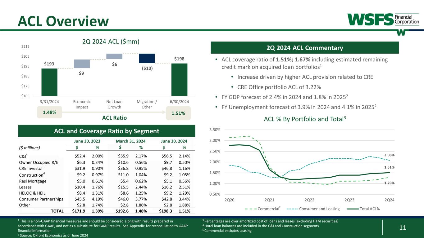 10 $0.0 $0.1 $0.2 $0.3 $0.4 $0.5 2H24 2025 2026 2027 2028 Bi lli on s Volume of Maturing CRE Loans by Industry Office Multi-Family Industrial/Flex Retail Single Family Other CRE and Select Portfolios 1 Inclusive of Construction 2 Office CRE portfolio excludes $98.0mm ($102.2mm exposure) of Medical Office CRE/Construction 3 Central Business District CRE Portfolio: • Granular with an average loan of $1.2mm; 11 relationships over $50mm • ~80% of the portfolio effectively has a fixed rate (40% of the portfolio fixed with ~67% of variable rates swapped) • ~9% of the portfolio is maturing in 2024; 50% of loans mature post-2028 • Continually reviewing all $2.5mm+ loans maturing in the next 24 months • Less than $50mm of loans in 2024 and $80mm in 2025 have a DSCR below 1.05x in a 7.50% rate scenario; proactively addressing all maturing loans • $670mm with $701mm exposure2; 5.1% of gross loans • $1.8mm average loan size • 77% Suburban and 23% Urban; 8% of Office is in CBD3 • 14 loans over $10mm; 3 loans >$20mm (largest ~$27mm) • Average LTV of ~60% at origination • 0% DLQ; <1% NCO; <1% NPA; 12% problem loans • 82% with recourse Office Portfolio1 • $1.4b with $1.8b exposure; 11.0% of gross loans • $3.1mm average loan size • 51% Suburban and 49% Urban; 6% of CRE Multi-Family is in CBD3 • 20 loans over $20mm; largest loan ~$35mm • Average LTV of ~56% at origination • <1% DLQ; 0% NCO; <1% NPA; 4% problem loans • 86% with recourse Multifamily Portfolio1 8.8% 11.5% 8.1% 10.4% 11.3% Portfolio Maturity %