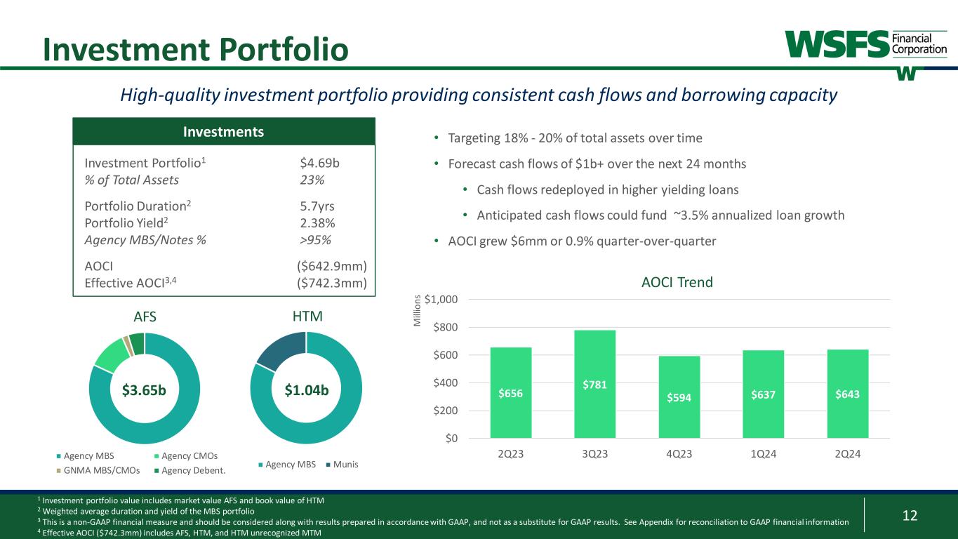 11 ACL Ratio $165 $175 $185 $195 $205 $215 3/31/2024 Economic Impact Net Loan Growth Migration / Other 6/30/2024 2Q 2024 ACL ($mm) $9 ($10) $198 $6 1 This is a non-GAAP financial measures and should be considered along with results prepared in accordance with GAAP, and not as a substitute for GAAP results. See Appendix for reconciliation to GAAP financial information 2 Source: Oxford Economics as of June 2024 ACL Overview ACL and Coverage Ratio by Segment 2Q 2024 ACL Commentary 1.51% • ACL coverage ratio of 1.51%; 1.67% including estimated remaining credit mark on acquired loan portfolios1 • Increase driven by higher ACL provision related to CRE • CRE Office portfolio ACL of 3.22% • FY GDP forecast of 2.4% in 2024 and 1.8% in 20252 • FY Unemployment forecast of 3.9% in 2024 and 4.1% in 20252 1.48% 1.29% 2.08% 1.51% 0.50% 1.00% 1.50% 2.00% 2.50% 3.00% 3.50% 2Q20 2Q21 2Q22 2Q23 2Q24 ACL % By Portfolio and Total3 Commercial Consumer and Leasing Total ACL%5 3 Percentages are over amortized cost of loans and leases (excluding HTM securities) 4 Hotel loan balances are included in the C&I and Construction segments 5 Commercial excludes Leasing $193 ($ millions) $ % $ % $ % C&I4 $52.4 2.00% $55.9 2.17% $56.5 2.14% Owner Occupied R/E $6.3 0.34% $10.6 0.56% $9.7 0.50% CRE Investor $31.9 0.90% $36.8 0.95% $46.8 1.16% Construction4 $9.2 0.97% $11.0 1.04% $9.2 1.05% Resi Mortgage $5.0 0.61% $5.4 0.62% $5.1 0.56% Leases $10.4 1.76% $15.5 2.44% $16.2 2.51% HELOC & HEIL $8.4 1.31% $8.6 1.25% $9.2 1.29% Consumer Partnerships $45.5 4.19% $46.0 3.77% $42.8 3.44% Other $2.8 1.74% $2.8 1.86% $2.8 1.88% TOTAL $171.9 1.39% $192.6 1.48% $198.3 1.51% June 30, 2023 March 31, 2024 June 30, 2024