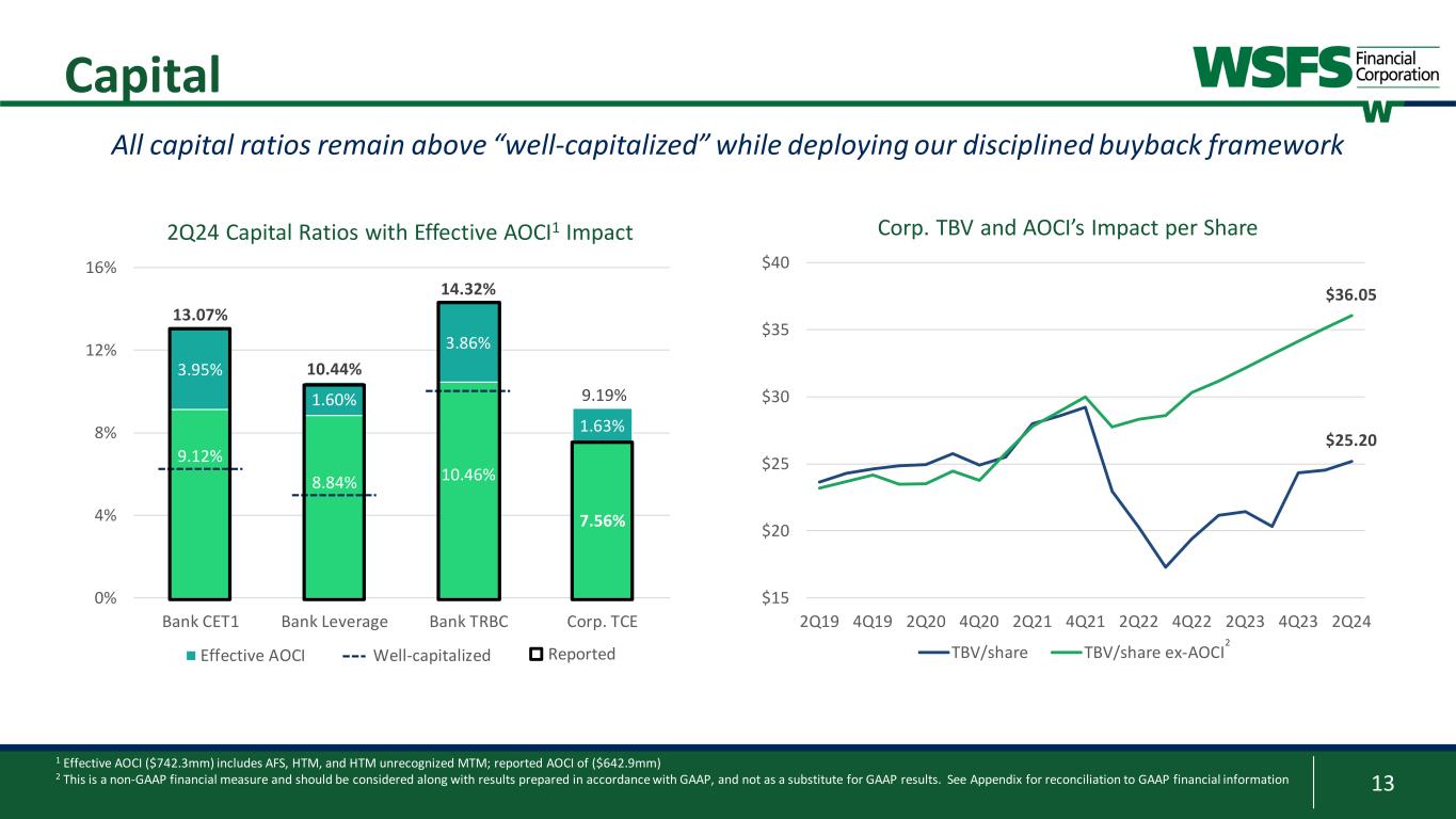 12 Investment Portfolio High-quality investment portfolio providing consistent cash flows and borrowing capacity 1 Investment portfolio value includes market value AFS and book value of HTM 2 Weighted average duration and yield of the MBS portfolio 3 This is a non-GAAP financial measure and should be considered along with results prepared in accordance with GAAP, and not as a substitute for GAAP results. See Appendix for reconciliation to GAAP financial information 4 Effective AOCI ($742.3mm) includes AFS, HTM, and HTM unrecognized MTM • Targeting 18% - 20% of total assets over time • Forecast cash flows of $1b+ over the next 24 months • Cash flows redeployed in higher yielding loans • Anticipated cash flows could fund ~3.5% annualized loan growth • AOCI grew $6mm or 0.9% quarter-over-quarter Investments Investment Portfolio1 $4.69b % of Total Assets 23% Portfolio Duration2 5.7yrs Portfolio Yield2 2.38% Agency MBS/Notes % >95% AOCI ($642.9mm) Effective AOCI3,4 ($742.3mm) AFS Agency MBS Agency CMOs GNMA MBS/CMOs Agency Debent. HTM Agency MBS Munis $3.65b $1.04b $656 $781 $594 $637 $643 $0 $200 $400 $600 $800 $1,000 2Q23 3Q23 4Q23 1Q24 2Q24 M ill io ns AOCI Trend