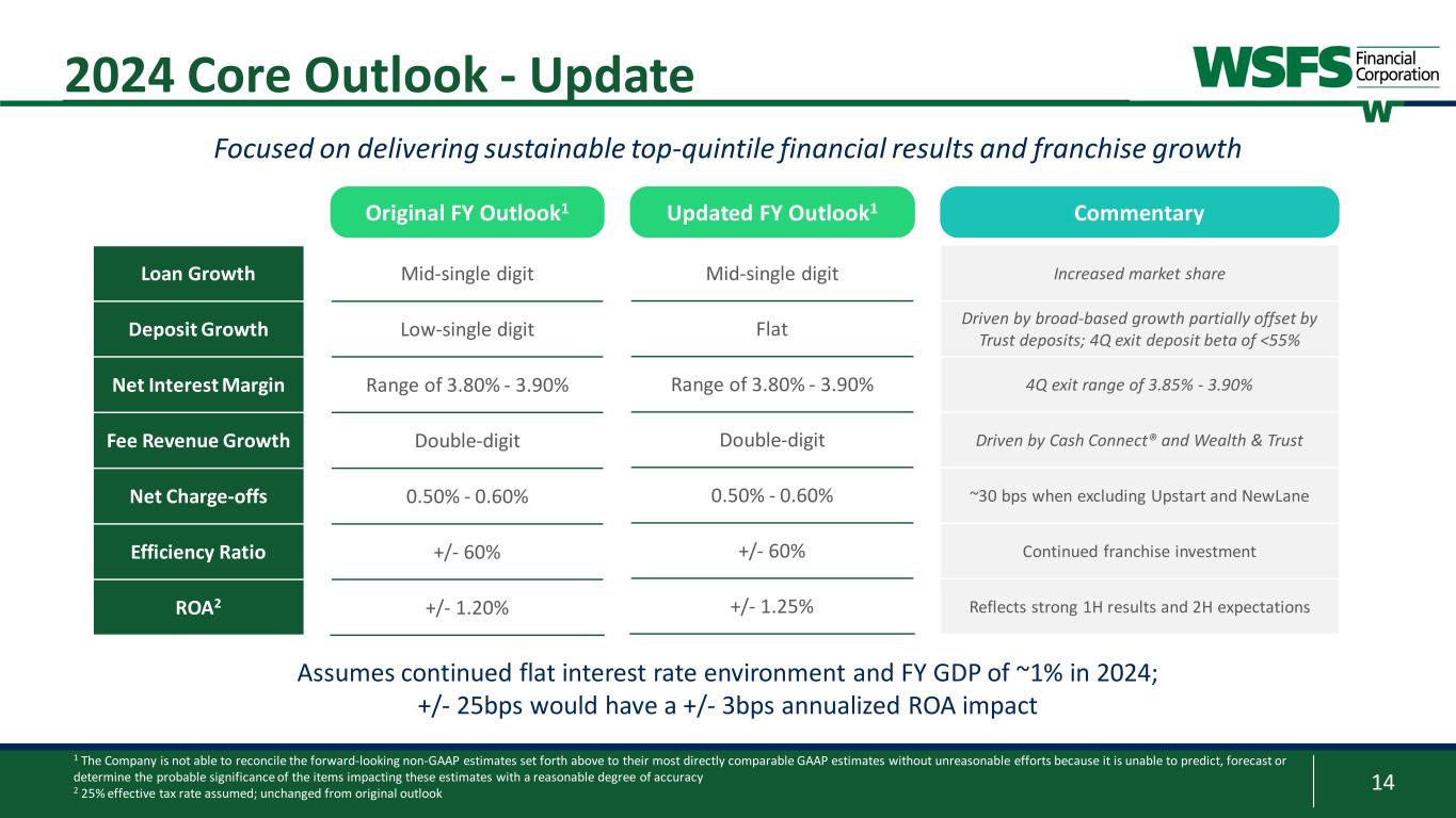 13 $25.20 $36.05 $15 $20 $25 $30 $35 $40 2Q19 4Q19 2Q20 4Q20 2Q21 4Q21 2Q22 4Q22 2Q23 4Q23 2Q24 Corp. TBV and AOCI’s Impact per Share TBV/share TBV/share ex-AOCI Capital All capital ratios remain above “well-capitalized” while deploying our disciplined buyback framework 9.12% 8.84% 10.46% 7.56% 3.95% 1.60% 3.86% 1.63% 13.07% 10.44% 14.32% 9.19% 0% 4% 8% 12% 16% Bank CET1 Bank Leverage Bank TRBC Corp. TCE Effective AOCI Well-capitalized Reported 2Q24 Capital Ratios with Effective AOCI1 Impact 1 Effective AOCI ($742.3mm) includes AFS, HTM, and HTM unrecognized MTM; reported AOCI of ($642.9mm) 2 This is a non-GAAP financial measure and should be considered along with results prepared in accordance with GAAP, and not as a substitute for GAAP results. See Appendix for reconciliation to GAAP financial information 2