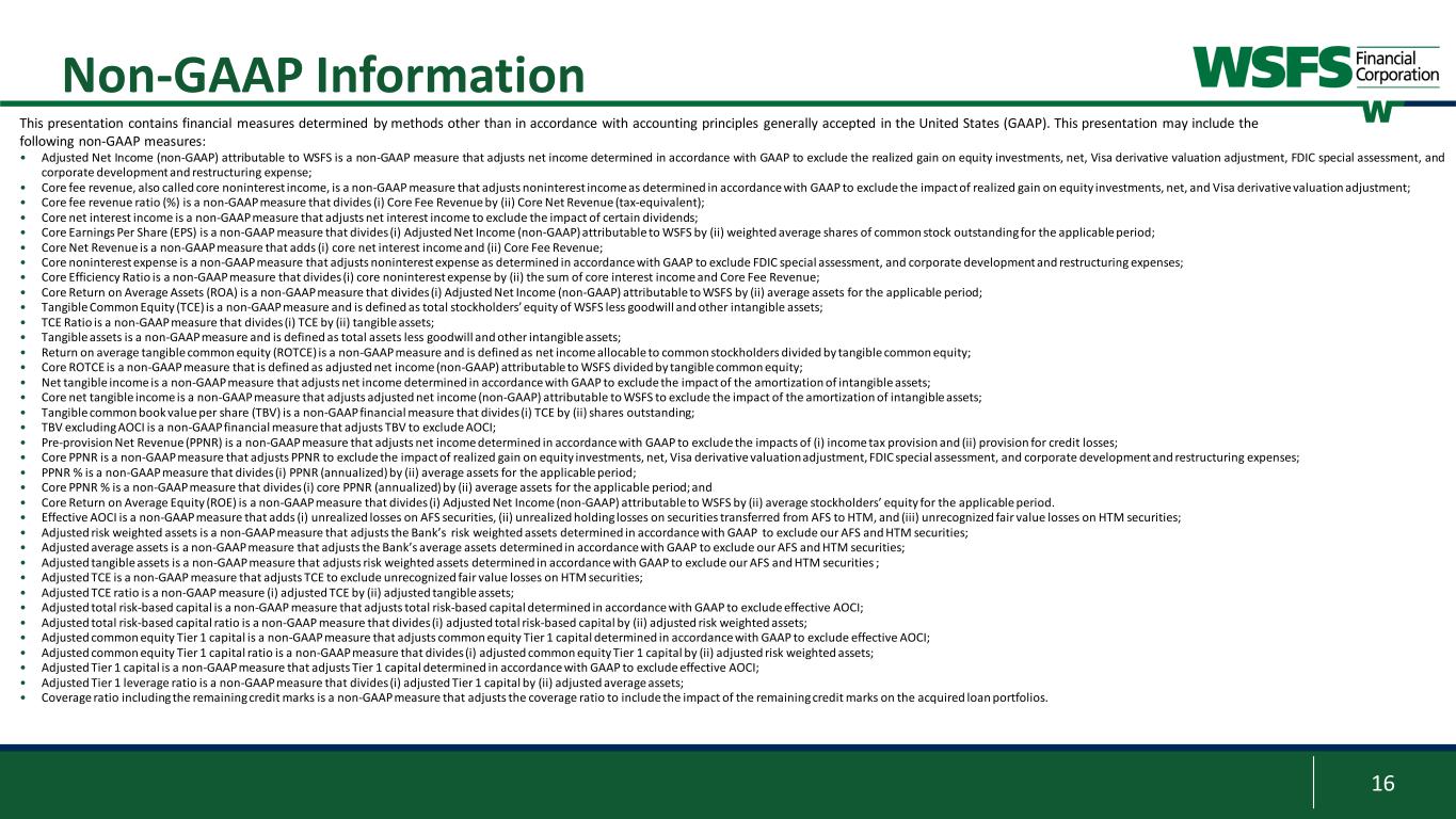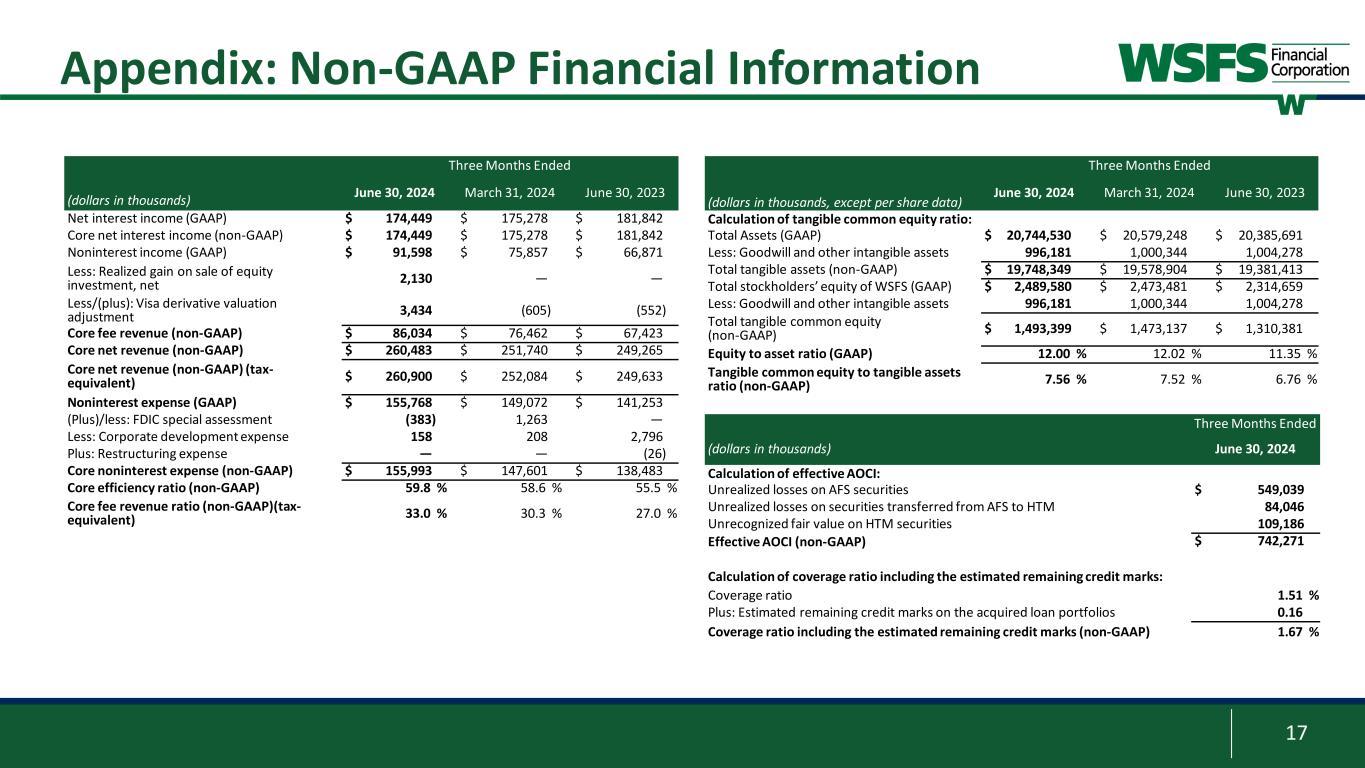16 Non-GAAP Information This presentation contains financial measures determined by methods other than in accordance with accounting principles generally accepted in the United States (GAAP). This presentation may include the following non-GAAP measures: • Adjusted Net Income (non-GAAP) attributable to WSFS is a non-GAAP measure that adjusts net income determined in accordance with GAAP to exclude the realized gain on equity investments, net, Visa derivative valuation adjustment, FDIC special assessment, and corporate development and restructuring expense; • Core fee revenue, also called core noninterest income, is a non-GAAP measure that adjusts noninterest income as determined in accordance with GAAP to exclude the impact of realized gain on equity investments, net, and Visa derivative valuation adjustment; • Core fee revenue ratio (%) is a non-GAAP measure that divides (i) Core Fee Revenue by (ii) Core Net Revenue (tax-equivalent); • Core net interest income is a non-GAAP measure that adjusts net interest income to exclude the impact of certain dividends; • Core Earnings Per Share (EPS) is a non-GAAP measure that divides (i) Adjusted Net Income (non-GAAP) attributable to WSFS by (ii) weighted average shares of common stock outstanding for the applicable period; • Core Net Revenue is a non-GAAP measure that adds (i) core net interest income and (ii) Core Fee Revenue; • Core noninterest expense is a non-GAAP measure that adjusts noninterest expense as determined in accordance with GAAP to exclude FDIC special assessment, and corporate development and restructuring expenses; • Core Efficiency Ratio is a non-GAAP measure that divides (i) core noninterest expense by (ii) the sum of core interest income and Core Fee Revenue; • Core Return on Average Assets (ROA) is a non-GAAP measure that divides (i) Adjusted Net Income (non-GAAP) attributable to WSFS by (ii) average assets for the applicable period; • Tangible Common Equity (TCE) is a non-GAAP measure and is defined as total stockholders’ equity of WSFS less goodwill and other intangible assets; • TCE Ratio is a non-GAAP measure that divides (i) TCE by (ii) tangible assets; • Tangible assets is a non-GAAP measure and is defined as total assets less goodwill and other intangible assets; • Return on average tangible common equity (ROTCE) is a non-GAAP measure and is defined as net income allocable to common stockholders divided by tangible common equity; • Core ROTCE is a non-GAAP measure that is defined as adjusted net income (non-GAAP) attributable to WSFS divided by tangible common equity; • Net tangible income is a non-GAAP measure that adjusts net income determined in accordance with GAAP to exclude the impact of the amortization of intangible assets; • Core net tangible income is a non-GAAP measure that adjusts adjusted net income (non-GAAP) attributable to WSFS to exclude the impact of the amortization of intangible assets; • Tangible common book value per share (TBV) is a non-GAAP financial measure that divides (i) TCE by (ii) shares outstanding; • TBV excluding AOCI is a non-GAAP financial measure that adjusts TBV to exclude AOCI; • Pre-provision Net Revenue (PPNR) is a non-GAAP measure that adjusts net income determined in accordance with GAAP to exclude the impacts of (i) income tax provision and (ii) provision for credit losses; • Core PPNR is a non-GAAP measure that adjusts PPNR to exclude the impact of realized gain on equity investments, net, Visa derivative valuation adjustment, FDIC special assessment, and corporate development and restructuring expenses; • PPNR % is a non-GAAP measure that divides (i) PPNR (annualized) by (ii) average assets for the applicable period; • Core PPNR % is a non-GAAP measure that divides (i) core PPNR (annualized) by (ii) average assets for the applicable period; and • Core Return on Average Equity (ROE) is a non-GAAP measure that divides (i) Adjusted Net Income (non-GAAP) attributable to WSFS by (ii) average stockholders’ equity for the applicable period. • Effective AOCI is a non-GAAP measure that adds (i) unrealized losses on AFS securities, (ii) unrealized holding losses on securities transferred from AFS to HTM, and (iii) unrecognized fair value losses on HTM securities; • Adjusted risk weighted assets is a non-GAAP measure that adjusts the Bank’s risk weighted assets determined in accordance with GAAP to exclude our AFS and HTM securities; • Adjusted average assets is a non-GAAP measure that adjusts the Bank’s average assets determined in accordance with GAAP to exclude our AFS and HTM securities; • Adjusted tangible assets is a non-GAAP measure that adjusts risk weighted assets determined in accordance with GAAP to exclude our AFS and HTM securities ; • Adjusted TCE is a non-GAAP measure that adjusts TCE to exclude unrecognized fair value losses on HTM securities; • Adjusted TCE ratio is a non-GAAP measure (i) adjusted TCE by (ii) adjusted tangible assets; • Adjusted total risk-based capital is a non-GAAP measure that adjusts total risk-based capital determined in accordance with GAAP to exclude effective AOCI; • Adjusted total risk-based capital ratio is a non-GAAP measure that divides (i) adjusted total risk-based capital by (ii) adjusted risk weighted assets; • Adjusted common equity Tier 1 capital is a non-GAAP measure that adjusts common equity Tier 1 capital determined in accordance with GAAP to exclude effective AOCI; • Adjusted common equity Tier 1 capital ratio is a non-GAAP measure that divides (i) adjusted common equity Tier 1 capital by (ii) adjusted risk weighted assets; • Adjusted Tier 1 capital is a non-GAAP measure that adjusts Tier 1 capital determined in accordance with GAAP to exclude effective AOCI; • Adjusted Tier 1 leverage ratio is a non-GAAP measure that divides (i) adjusted Tier 1 capital by (ii) adjusted average assets; • Coverage ratio including the remaining credit marks is a non-GA