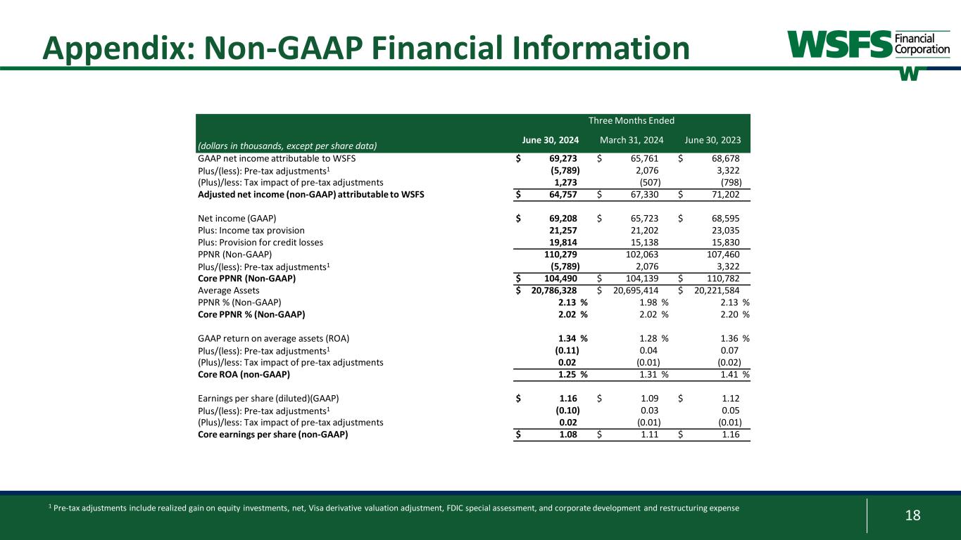 17 Appendix: Non-GAAP Financial Information Three Months Ended (dollars in thousands) June 30, 2024 March 31, 2024 June 30, 2023 Net interest income (GAAP) $ 174,449 $ 175,278 $ 181,842 Core net interest income (non-GAAP) $ 174,449 $ 175,278 $ 181,842 Noninterest income (GAAP) $ 91,598 $ 75,857 $ 66,871 Less: Realized gain on sale of equity investment, net 2,130 — — Less/(plus): Visa derivative valuation adjustment 3,434 (605) (552) Core fee revenue (non-GAAP) $ 86,034 $ 76,462 $ 67,423 Core net revenue (non-GAAP) $ 260,483 $ 251,740 $ 249,265 Core net revenue (non-GAAP) (tax- equivalent) $ 260,900 $ 252,084 $ 249,633 Noninterest expense (GAAP) $ 155,768 $ 149,072 $ 141,253 (Plus)/less: FDIC special assessment (383) 1,263 — Less: Corporate development expense 158 208 2,796 Plus: Restructuring expense — — (26) Core noninterest expense (non-GAAP) $ 155,993 $ 147,601 $ 138,483 Core efficiency ratio (non-GAAP) 59.8 % 58.6 % 55.5 % Core fee revenue ratio (non-GAAP)(tax- equivalent) 33.0 % 30.3 % 27.0 % Three Months Ended (dollars in thousands, except per share data) June 30, 2024 March 31, 2024 June 30, 2023 Calculation of tangible common equity ratio: Total Assets (GAAP) $ 20,744,530 $ 20,579,248 $ 20,385,691 Less: Goodwill and other intangible assets 996,181 1,000,344 1,004,278 Total tangible assets (non-GAAP) $ 19,748,349 $ 19,578,904 $ 19,381,413 Total stockholders’ equity of WSFS (GAAP) $ 2,489,580 $ 2,473,481 $ 2,314,659 Less: Goodwill and other intangible assets 996,181 1,000,344 1,004,278 Total tangible common equity (non-GAAP) $ 1,493,399 $ 1,473,137 $ 1,310,381 Equity to asset ratio (GAAP) 12.00 % 12.02 % 11.35 % Tangible common equity to tangible assets ratio (non-GAAP) 7.56 % 7.52 % 6.76 % Three Months Ended (dollars in thousands) June 30, 2024 Calculation of effective AOCI: Unrealized losses on AFS securities ​ $ 549,039 Unrealized losses on securities transferred from AFS to HTM 84,046 Unrecognized fair value on HTM securities 109,186 Effective AOCI (non-GAAP) $ 742,271 Calculation of coverage ratio including the estimated remaining credit marks: Coverage ratio 1.51 % Plus: Estimated remaining credit marks on the acquired loan portfolios 0.16 Coverage ratio including the estimated remaining credit marks (non-GAAP) 1.67 %