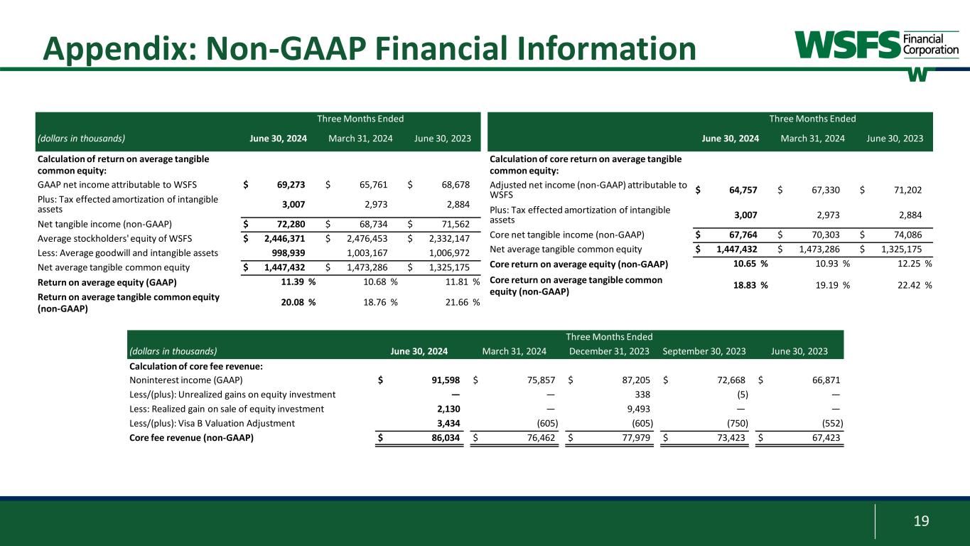 18 Appendix: Non-GAAP Financial Information Three Months Ended (dollars in thousands, except per share data) June 30, 2024 March 31, 2024 June 30, 2023 GAAP net income attributable to WSFS $ 69,273 $ 65,761 $ 68,678 Plus/(less): Pre-tax adjustments1 (5,789) 2,076 3,322 (Plus)/less: Tax impact of pre-tax adjustments 1,273 (507) (798) Adjusted net income (non-GAAP) attributable to WSFS $ 64,757 $ 67,330 $ 71,202 Net income (GAAP) $ 69,208 $ 65,723 $ 68,595 Plus: Income tax provision 21,257 21,202 23,035 Plus: Provision for credit losses 19,814 15,138 15,830 PPNR (Non-GAAP) 110,279 102,063 107,460 Plus/(less): Pre-tax adjustments1 (5,789) 2,076 3,322 Core PPNR (Non-GAAP) $ 104,490 $ 104,139 $ 110,782 Average Assets $ 20,786,328 $ 20,695,414 $ 20,221,584 PPNR % (Non-GAAP) 2.13 % 1.98 % 2.13 % Core PPNR % (Non-GAAP) 2.02 % 2.02 % 2.20 % GAAP return on average assets (ROA) 1.34 % 1.28 % 1.36 % Plus/(less): Pre-tax adjustments1 (0.11) 0.04 0.07 (Plus)/less: Tax impact of pre-tax adjustments 0.02 (0.01) (0.02) Core ROA (non-GAAP) 1.25 % 1.31 % 1.41 % Earnings per share (diluted)(GAAP) $ 1.16 $ 1.09 $ 1.12 Plus/(less): Pre-tax adjustments1 (0.10) 0.03 0.05 (Plus)/less: Tax impact of pre-tax adjustments 0.02 (0.01) (0.01) Core earnings per share (non-GAAP) $ 1.08 $ 1.11 $ 1.16 1 Pre-tax adjustments include realized gain on equity investments, net, Visa derivative valuation adjustment, FDIC special assessment, and corporate development and restructuring expense