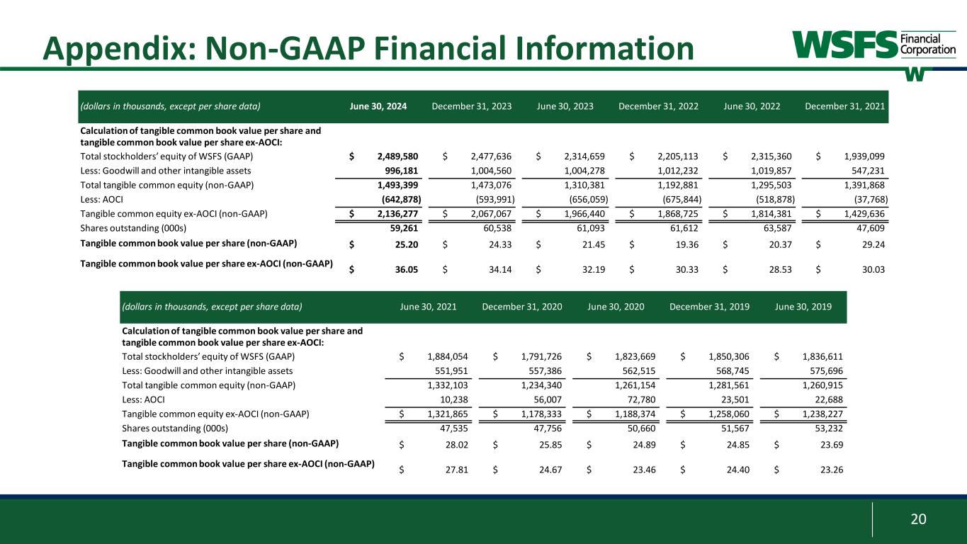 19 Appendix: Non-GAAP Financial Information Three Months Ended (dollars in thousands) June 30, 2024 March 31, 2024 June 30, 2023 Calculation of return on average tangible common equity: GAAP net income attributable to WSFS​ $ 69,273 $ 65,761 $ 68,678 Plus: Tax effected amortization of intangible assets​ 3,007 2,973 2,884 Net tangible income (non-GAAP)​ $ 72,280 $ 68,734 $ 71,562 Average stockholders' equity of WSFS​ $ 2,446,371 $ 2,476,453 $ 2,332,147 Less: Average goodwill and intangible assets​ 998,939 1,003,167 1,006,972 Net average tangible common equity​ $ 1,447,432 $ 1,473,286 $ 1,325,175 Return on average equity (GAAP) 11.39 % 10.68 % 11.81 % Return on average tangible common equity (non-GAAP) 20.08 % 18.76 % 21.66 % Three Months Ended June 30, 2024 March 31, 2024 June 30, 2023 Calculation of core return on average tangible common equity: Adjusted net income (non-GAAP) attributable to WSFS​ $ 64,757 $ 67,330 $ 71,202 Plus: Tax effected amortization of intangible assets​ 3,007 2,973 2,884 Core net tangible income (non-GAAP)​ $ 67,764 $ 70,303 $ 74,086 Net average tangible common equity​ $ 1,447,432 $ 1,473,286 $ 1,325,175 Core return on average equity (non-GAAP) 10.65 % 10.93 % 12.25 % Core return on average tangible common equity (non-GAAP) 18.83 % 19.19 % 22.42 % Three Months Ended (dollars in thousands) June 30, 2024 March 31, 2024 December 31, 2023 September 30, 2023 June 30, 2023 Calculation of core fee revenue: Noninterest income (GAAP) $ 91,598 $ 75,857 $ 87,205 $ 72,668 $ 66,871 Less/(plus): Unrealized gains on equity investment — — 338 (5) — Less: Realized gain on sale of equity investment 2,130 — 9,493 — — Less/(plus): Visa B Valuation Adjustment 3,434 (605) (605) (750) (552) Core fee revenue (non-GAAP) $ 86,034 $ 76,462 $ 77,979 $ 73,423 $ 67,423