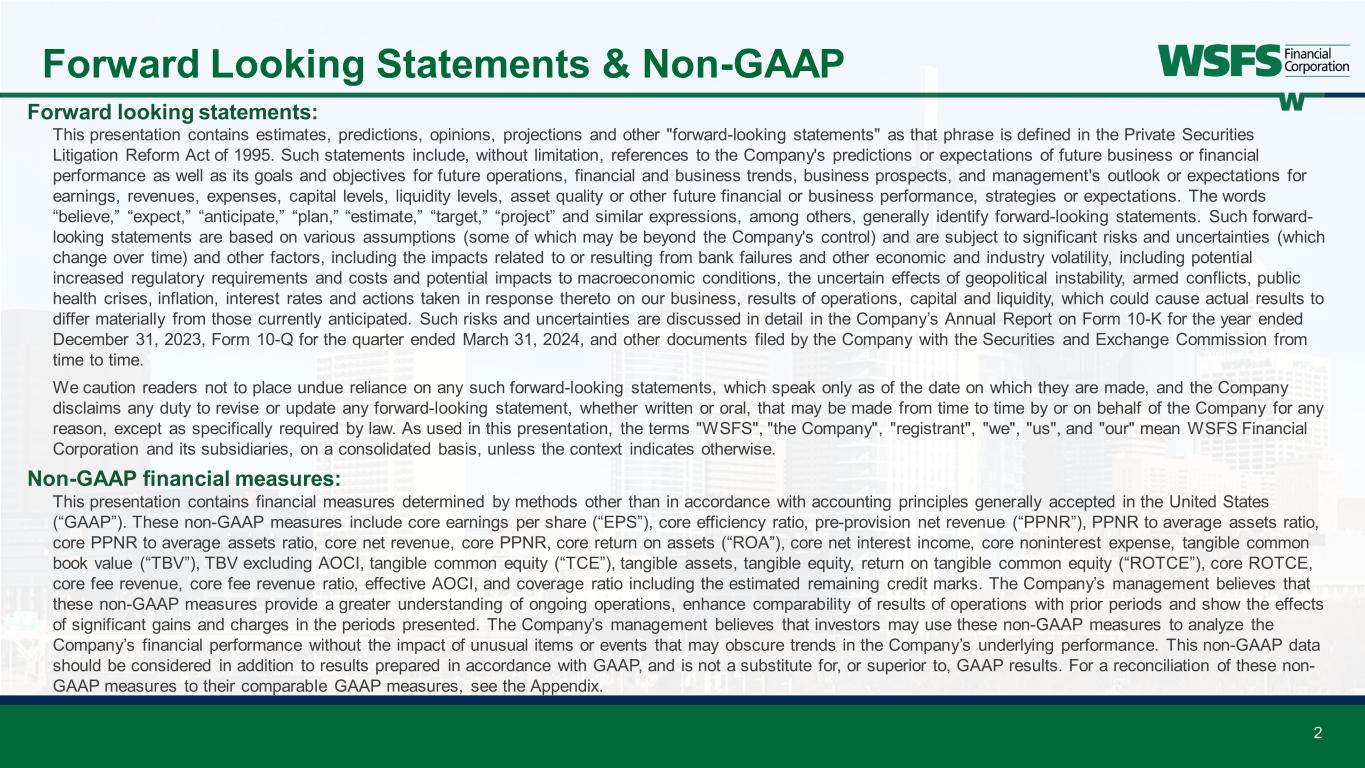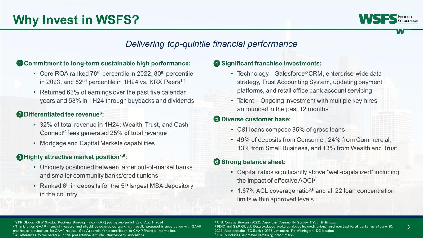 Forward Looking Statements & Non-GAAP Forward looking statements: This presentation contains estimates, predictions, opinions, projections and other "forward-looking statements" as that phrase is defined in the Private Securities Litigation Reform Act of 1995. Such statements include, without limitation, references to the Company's predictions or expectations of future business or financial performance as well as its goals and objectives for future operations, financial and business trends, business prospects, and management's outlook or expectations for earnings, revenues, expenses, capital levels, liquidity levels, asset quality or other future financial or business performance, strategies or expectations. The words “believe,” “expect,” “anticipate,” “plan,” “estimate,” “target,” “project” and similar expressions, among others, generally identify forward-looking statements. Such forward- looking statements are based on various assumptions (some of which may be beyond the Company's control) and are subject to significant risks and uncertainties (which change over time) and other factors, including the impacts related to or resulting from bank failures and other economic and industry volatility, including potential increased regulatory requirements and costs and potential impacts to macroeconomic conditions, the uncertain effects of geopolitical instability, armed conflicts, public health crises, inflation, interest rates and actions taken in response thereto on our business, results of operations, capital and liquidity, which could cause actual results to differ materially from those currently anticipated. Such risks and uncertainties are discussed in detail in the Company’s Annual Report on Form 10-K for the year ended December 31, 2023, Form 10-Q for the quarter ended March 31, 2024, and other documents filed by the Company with the Securities and Exchange Commission from time to time. We caution readers not to place undue reliance on any such forward-looking statements, which speak only as of the date on which they are made, and the Company disclaims any duty to revise or update any forward-looking statement, whether written or oral, that may be made from time to time by or on behalf of the Company for any reason, except as specifically required by law. As used in this presentation, the terms "WSFS", "the Company", "registrant", "we", "us", and "our" mean WSFS Financial Corporation and its subsidiaries, on a consolidated basis, unless the context indicates otherwise. Non-GAAP financial measures: This presentation contains financial measures determined by methods other than in accordance with accounting principles generally accepted in the United States (“GAAP”). These non-GAAP measures include core earnings per share (“EPS”), core efficiency ratio, pre-provision net revenue (“PPNR”), PPNR to average assets ratio, core PPNR to average assets ratio, core net revenue, core PPNR, core return on assets (“ROA”), core net interest income, core noninterest expense, tangible common book value (“TBV”), TBV excluding AOCI, tangible common equity (“TCE”), tangible assets, tangible equity, return on tangible common equity (“ROTCE”), core ROTCE, core fee revenue, core fee revenue ratio, effective AOCI, and coverage ratio including the estimated remaining credit marks. The Company’s management believes that these non-GAAP measures provide a greater understanding of ongoing operations, enhance comparability of results of operations with prior periods and show the effects of significant gains and charges in the periods presented. The Company’s management believes that investors may use these non-GAAP measures to analyze the Company’s financial performance without the impact of unusual items or events that may obscure trends in the Company’s underlying performance. This non-GAAP data should be considered in addition to results prepared in accordance with GAAP, and is not a substitute for, or superior to, GAAP results. For a reconciliation of these non- GAAP measures to their comparable GAAP measures, see the Appendix. 2