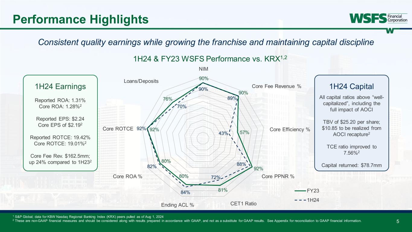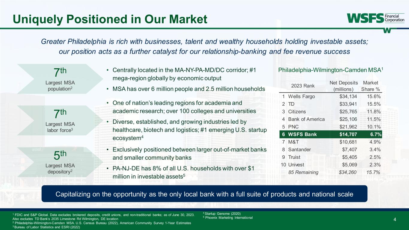 Significant franchise investments: • Technology – Salesforce© CRM, enterprise-wide data strategy, Trust Accounting System, updating payment platforms, and retail office bank account servicing • Talent – Ongoing investment with multiple key hires announced in the past 12 months Diverse customer base: • C&I loans compose 35% of gross loans • 49% of deposits from Consumer, 24% from Commercial, 13% from Small Business, and 13% from Wealth and Trust Strong balance sheet: • Capital ratios significantly above “well-capitalized” including the impact of effective AOCI2 • 1.67% ACL coverage ratio2,6 and all 22 loan concentration limits within approved levels Commitment to long-term sustainable high performance: • Core ROA ranked 78th percentile in 2022, 80th percentile in 2023, and 82nd percentile in 1H24 vs. KRX Peers1,2 • Returned 63% of earnings over the past five calendar years and 58% in 1H24 through buybacks and dividends Differentiated fee revenue3: • 32% of total revenue in 1H24; Wealth, Trust, and Cash Connect® fees generated 25% of total revenue • Mortgage and Capital Markets capabilities Highly attractive market position4,5: • Uniquely positioned between larger out-of-market banks and smaller community banks/credit unions • Ranked 6th in deposits for the 5th largest MSA depository in the country Delivering top-quintile financial performance 3 Why Invest in WSFS? 1 2 3 4 5 1 S&P Global; KBW Nasdaq Regional Banking Index (KRX) peer group pulled as of Aug 1, 2024 2 This is a non-GAAP financial measure and should be considered along with results prepared in accordance with GAAP, and not as a substitute for GAAP results. See Appendix for reconciliation to GAAP financial information. 3 All references to fee revenue in this presentation exclude intercompany allocations 4 U.S. Census Bureau (2022), American Community Survey 1-Year Estimates 5 FDIC and S&P Global. Data excludes brokered deposits, credit unions, and non-traditional banks; as of June 30, 2023. Also excludes TD Bank’s 2035 Limestone Rd Wilmington, DE location 6 1.67% includes estimated remaining credit marks. 6