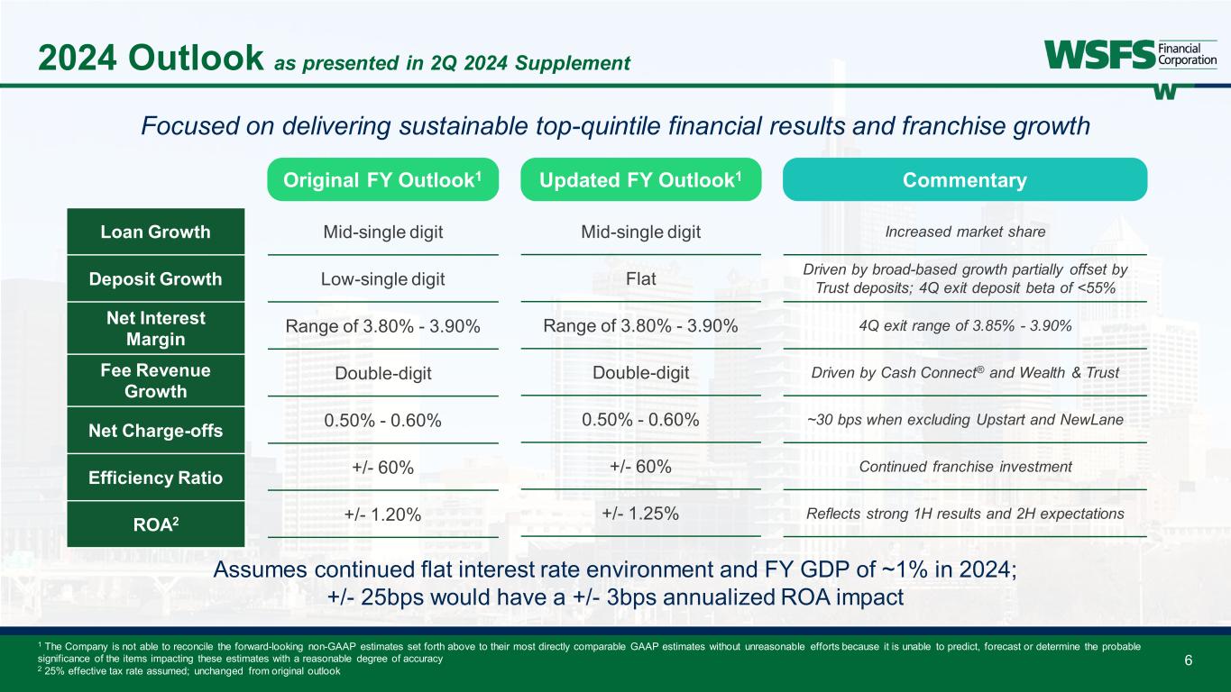 5 Performance Highlights 1 S&P Global; data for KBW Nasdaq Regional Banking Index (KRX) peers pulled as of Aug 1, 2024 2 These are non-GAAP financial measures and should be considered along with results prepared in accordance with GAAP, and not as a substitute for GAAP results. See Appendix for reconciliation to GAAP financial information. NIM Core Fee Revenue % Core Efficiency % Core PPNR % CET1 RatioEnding ACL % Core ROA % Core ROTCE Loans/Deposits 1H24 & FY23 WSFS Performance vs. KRX1,2 FY23 1H24 76% 70% 90% 90% 90% 89% 57% 92% 92% 43% 88% 80% 84% 80% 82% 92% 81% 72% 1H24 Earnings Reported ROA: 1.31% Core ROA: 1.28%2 Reported EPS: $2.24 Core EPS of $2.192 Reported ROTCE: 19.42% Core ROTCE: 19.01%2 Core Fee Rev. $162.5mm; up 24% compared to 1H232 1H24 Capital All capital ratios above “well- capitalized”, including the full impact of AOCI TBV of $25.20 per share; $10.85 to be realized from AOCI recapture2 TCE ratio improved to 7.56%2 Capital returned: $78.7mm Consistent quality earnings while growing the franchise and maintaining capital discipline