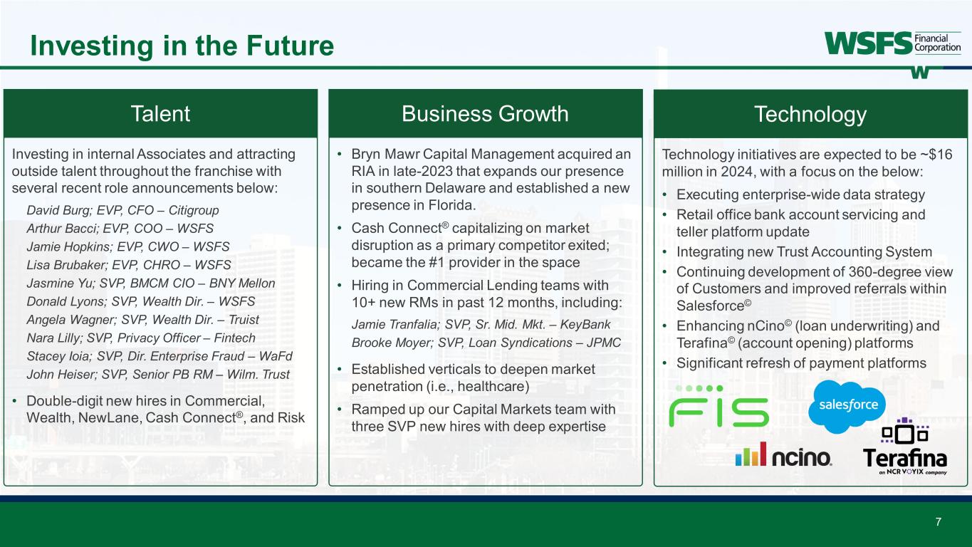 6 2024 Outlook as presented in 2Q 2024 Supplement 1 The Company is not able to reconcile the forward-looking non-GAAP estimates set forth above to their most directly comparable GAAP estimates without unreasonable efforts because it is unable to predict, forecast or determine the probable significance of the items impacting these estimates with a reasonable degree of accuracy 2 25% effective tax rate assumed; unchanged from original outlook Original FY Outlook1 Mid-single digit Low-single digit Range of 3.80% - 3.90% Double-digit 0.50% - 0.60% +/- 60% +/- 1.20% Updated FY Outlook1 Mid-single digit Flat Range of 3.80% - 3.90% Double-digit 0.50% - 0.60% +/- 60% +/- 1.25% Loan Growth Deposit Growth Net Interest Margin Fee Revenue Growth Net Charge-offs Efficiency Ratio ROA2 Commentary Increased market share Driven by broad-based growth partially offset by Trust deposits; 4Q exit deposit beta of <55% 4Q exit range of 3.85% - 3.90% Driven by Cash Connect® and Wealth & Trust ~30 bps when excluding Upstart and NewLane Continued franchise investment Reflects strong 1H results and 2H expectations Assumes continued flat interest rate environment and FY GDP of ~1% in 2024; +/- 25bps would have a +/- 3bps annualized ROA impact Focused on delivering sustainable top-quintile financial results and franchise growth