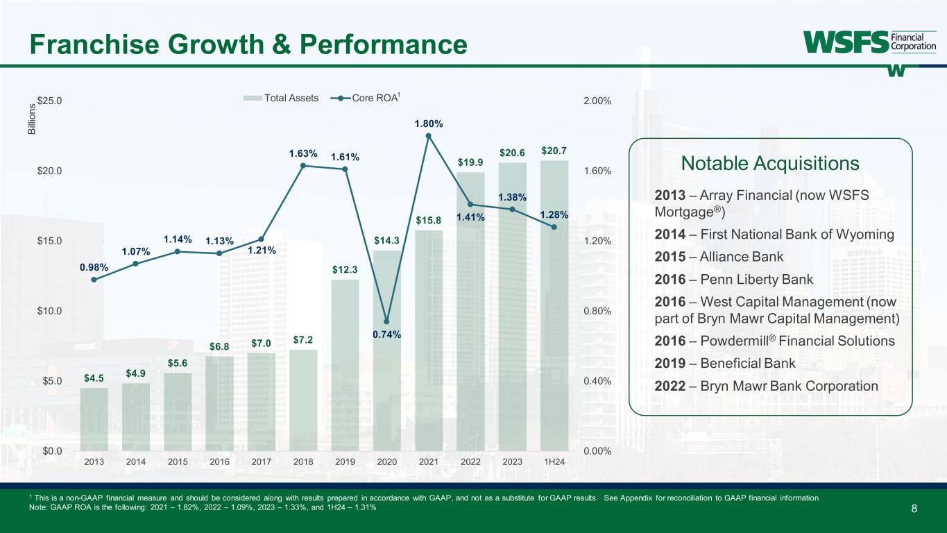 7 Investing in the Future Investing in internal Associates and attracting outside talent throughout the franchise with several recent role announcements below: David Burg; EVP, CFO – Citigroup Arthur Bacci; EVP, COO – WSFS Jamie Hopkins; EVP, CWO – WSFS Lisa Brubaker; EVP, CHRO – WSFS Jasmine Yu; SVP, BMCM CIO – BNY Mellon Donald Lyons; SVP, Wealth Dir. – WSFS Angela Wagner; SVP, Wealth Dir. – Truist Nara Lilly; SVP, Privacy Officer – Fintech Stacey Ioia; SVP, Dir. Enterprise Fraud – WaFd John Heiser; SVP, Senior PB RM – Wilm. Trust • Double-digit new hires in Commercial, Wealth, NewLane, Cash Connect®, and Risk Talent • Bryn Mawr Capital Management acquired an RIA in late-2023 that expands our presence in southern Delaware and established a new presence in Florida. • Cash Connect® capitalizing on market disruption as a primary competitor exited; became the #1 provider in the space • Hiring in Commercial Lending teams with 10+ new RMs in past 12 months, including: Jamie Tranfalia; SVP, Sr. Mid. Mkt. – KeyBank Brooke Moyer; SVP, Loan Syndications – JPMC • Established verticals to deepen market penetration (i.e., healthcare) • Ramped up our Capital Markets team with three SVP new hires with deep expertise Business Growth Technology initiatives are expected to be ~$16 million in 2024, with a focus on the below: • Executing enterprise-wide data strategy • Retail office bank account servicing and teller platform update • Integrating new Trust Accounting System • Continuing development of 360-degree view of Customers and improved referrals within Salesforce© • Enhancing nCino© (loan underwriting) and Terafina© (account opening) platforms • Significant refresh of payment platforms Technology