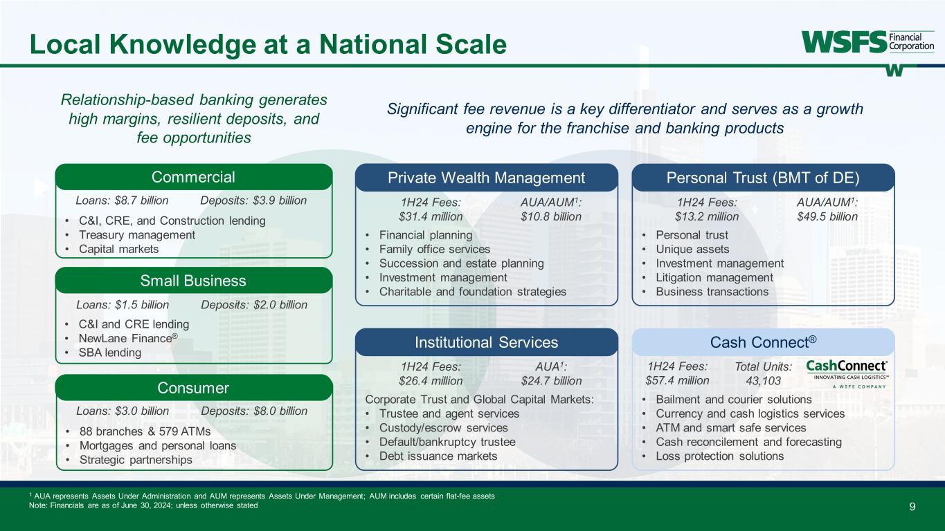 8 Franchise Growth & Performance $4.5 $4.9 $5.6 $6.8 $7.0 $7.2 $12.3 $14.3 $15.8 $19.9 $20.6 $20.7 0.98% 1.07% 1.14% 1.13% 1.21% 1.63% 1.61% 0.74% 1.80% 1.41% 1.38% 1.28% 0.00% 0.40% 0.80% 1.20% 1.60% 2.00% $0.0 $5.0 $10.0 $15.0 $20.0 $25.0 2013 2014 2015 2016 2017 2018 2019 2020 2021 2022 2023 1H24 Bi llio ns Total Assets Core ROA Notable Acquisitions 2013 – Array Financial (now WSFS Mortgage®) 2014 – First National Bank of Wyoming 2015 – Alliance Bank 2016 – Penn Liberty Bank 2016 – West Capital Management (now part of Bryn Mawr Capital Management) 2016 – Powdermill® Financial Solutions 2019 – Beneficial Bank 2022 – Bryn Mawr Bank Corporation 1 This is a non-GAAP financial measure and should be considered along with results prepared in accordance with GAAP, and not as a substitute for GAAP results. See Appendix for reconciliation to GAAP financial information Note: GAAP ROA is the following: 2021 – 1.82%, 2022 – 1.09%, 2023 – 1.33%, and 1H24 – 1.31% 1