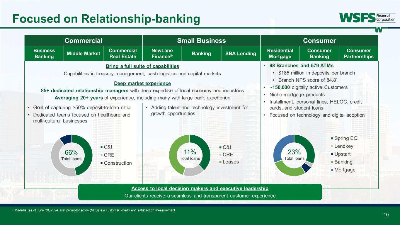9 Local Knowledge at a National Scale • Financial planning • Family office services • Succession and estate planning • Investment management • Charitable and foundation strategies Private Wealth Management Corporate Trust and Global Capital Markets: • Trustee and agent services • Custody/escrow services • Default/bankruptcy trustee • Debt issuance markets Institutional Services • Personal trust • Unique assets • Investment management • Litigation management • Business transactions Personal Trust (BMT of DE) • Bailment and courier solutions • Currency and cash logistics services • ATM and smart safe services • Cash reconcilement and forecasting • Loss protection solutions Cash Connect® 1H24 Fees: $31.4 million AUA/AUM1: $10.8 billion 1H24 Fees: $13.2 million AUA/AUM1: $49.5 billion 1H24 Fees: $26.4 million AUA1: $24.7 billion 1H24 Fees: $57.4 million Total Units: 43,103 Relationship-based banking generates high margins, resilient deposits, and fee opportunities 1 AUA represents Assets Under Administration and AUM represents Assets Under Management; AUM includes certain flat-fee assets Note: Financials are as of June 30, 2024; unless otherwise stated Significant fee revenue is a key differentiator and serves as a growth engine for the franchise and banking products • 88 branches & 579 ATMs • Mortgages and personal loans • Strategic partnerships Consumer Loans: $3.0 billion Deposits: $8.0 billion • C&I, CRE, and Construction lending • Treasury management • Capital markets Commercial Loans: $8.7 billion Deposits: $3.9 billion • C&I and CRE lending • NewLane Finance® • SBA lending Small Business Loans: $1.5 billion Deposits: $2.0 billion