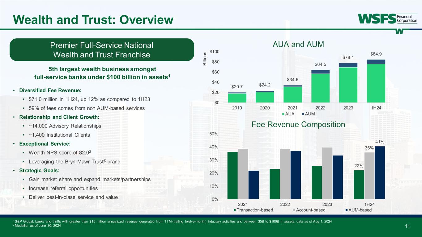 Commercial Small Business Consumer Business Banking Middle Market Commercial Real Estate NewLane Finance® Banking SBA Lending Residential Mortgage Consumer Banking Consumer Partnerships Bring a full suite of capabilities Capabilities in treasury management, cash logistics and capital markets Deep market experience 85+ dedicated relationship managers with deep expertise of local economy and industries Averaging 20+ years of experience, including many with large bank experience • 88 Branches and 579 ATMs • $185 million in deposits per branch • Branch NPS score of 84.81 • ~150,000 digitally active Customers • Niche mortgage products • Installment, personal lines, HELOC, credit cards, and student loans • Focused on technology and digital adoption • Goal of capturing >50% deposit-to-loan ratio • Dedicated teams focused on healthcare and multi-cultural businesses • Adding talent and technology investment for growth opportunities C&I CRE Construction C&I CRE Leases Access to local decision makers and executive leadership Our clients receive a seamless and transparent customer experience 10 Focused on Relationship-banking Spring EQ Lendkey Upstart Banking Mortgage 23% Total loans 66% Total loans 11% Total loans 1 Medallia; as of June 30, 2024. Net promotor score (NPS) is a customer loyalty and satisfaction measurement
