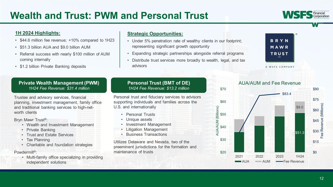 $20.7 $24.2 $34.6 $64.5 $78.1 $84.9 $0 $20 $40 $60 $80 $100 2019 2020 2021 2022 2023 1H24 Bi llio ns AUA AUM AUA and AUM 11 Wealth and Trust: Overview 5th largest wealth business amongst full-service banks under $100 billion in assets1 • Diversified Fee Revenue: • $71.0 million in 1H24, up 12% as compared to 1H23 • 59% of fees comes from non AUM-based services • Relationship and Client Growth: • ~14,000 Advisory Relationships • ~1,400 Institutional Clients • Exceptional Service: • Wealth NPS score of 82.02 • Leveraging the Bryn Mawr Trust® brand • Strategic Goals: • Gain market share and expand markets/partnerships • Increase referral opportunities • Deliver best-in-class service and value Premier Full-Service National Wealth and Trust Franchise 1 S&P Global; banks and thrifts with greater than $15 million annualized revenue generated from TTM (trailing twelve-month) fiduciary activities and between $5B to $100B in assets; data as of Aug 1, 2024 2 Medallia; as of June 30, 2024 22% 36% 41% 0% 10% 20% 30% 40% 50% 2021 2022 2023 1H24 Transaction-based Account-based AUM-based Fee Revenue Composition