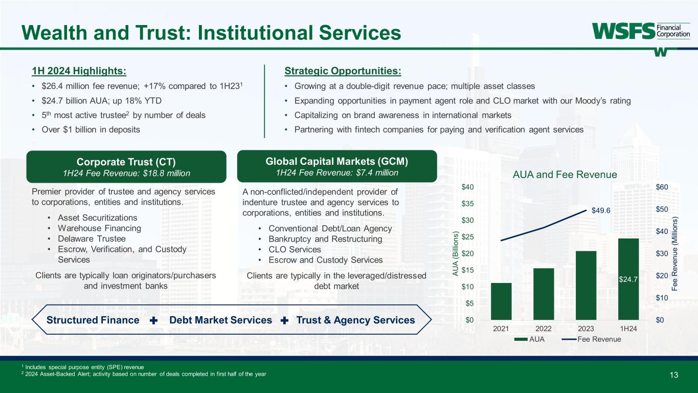 12 Wealth and Trust: PWM and Personal Trust Private Wealth Management (PWM) 1H24 Fee Revenue: $31.4 million Personal Trust (BMT of DE) 1H24 Fee Revenue: $13.2 million Trustee and advisory services, financial planning, investment management, family office and traditional banking services to high-net- worth clients Bryn Mawr Trust®: • Wealth and Investment Management • Private Banking • Trust and Estate Services • Tax Planning • Charitable and foundation strategies Powdermill®: • Multi-family office specializing in providing independent solutions Personal trust and fiduciary services to advisors supporting individuals and families across the U.S. and internationally • Personal Trusts • Unique assets • Investment Management • Litigation Management • Business Transactions Utilizes Delaware and Nevada, two of the preeminent jurisdictions for the formation and maintenance of trusts 1H 2024 Highlights: • $44.6 million fee revenue; +10% compared to 1H23 • $51.3 billion AUA and $9.0 billion AUM • Referral success with nearly $100 million of AUM coming internally • $1.2 billion Private Banking deposits Strategic Opportunities: • Under 5% penetration rate of wealthy clients in our footprint; representing significant growth opportunity • Expanding strategic partnerships alongside referral programs • Distribute trust services more broadly to wealth, legal, and tax advisors $51.3 $9.0 $83.4 $0 $15 $30 $45 $60 $75 $90 $20 $30 $40 $50 $60 $70 2021 2022 2023 1H24 Fe e R ev en ue (M illi on s) AU A/ AU M (B illi on s) AUA/AUM and Fee Revenue AUA AUM Fee Revenue