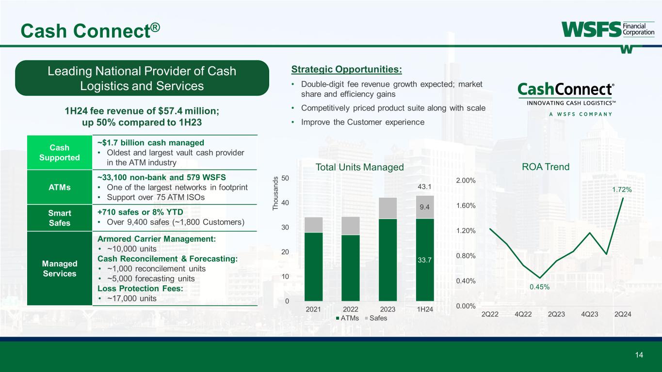 13 Wealth and Trust: Institutional Services 1H 2024 Highlights: • $26.4 million fee revenue; +17% compared to 1H231 • $24.7 billion AUA; up 18% YTD • 5th most active trustee2 by number of deals • Over $1 billion in deposits Global Capital Markets (GCM) 1H24 Fee Revenue: $7.4 million Corporate Trust (CT) 1H24 Fee Revenue: $18.8 million A non-conflicted/independent provider of indenture trustee and agency services to corporations, entities and institutions. • Conventional Debt/Loan Agency • Bankruptcy and Restructuring • CLO Services • Escrow and Custody Services Clients are typically in the leveraged/distressed debt market Premier provider of trustee and agency services to corporations, entities and institutions. • Asset Securitizations • Warehouse Financing • Delaware Trustee • Escrow, Verification, and Custody Services Clients are typically loan originators/purchasers and investment banks Strategic Opportunities: • Growing at a double-digit revenue pace; multiple asset classes • Expanding opportunities in payment agent role and CLO market with our Moody’s rating • Capitalizing on brand awareness in international markets • Partnering with fintech companies for paying and verification agent services $24.7 $49.6 $0 $10 $20 $30 $40 $50 $60 $0 $5 $10 $15 $20 $25 $30 $35 $40 2021 2022 2023 1H24 Fe e R ev en ue (M illi on s) AU A (B illi on s) AUA and Fee Revenue AUA Fee Revenue Trust & Agency ServicesStructured Finance Debt Market Services 1 Includes special purpose entity (SPE) revenue 2 2024 Asset-Backed Alert; activity based on number of deals completed in first half of the year