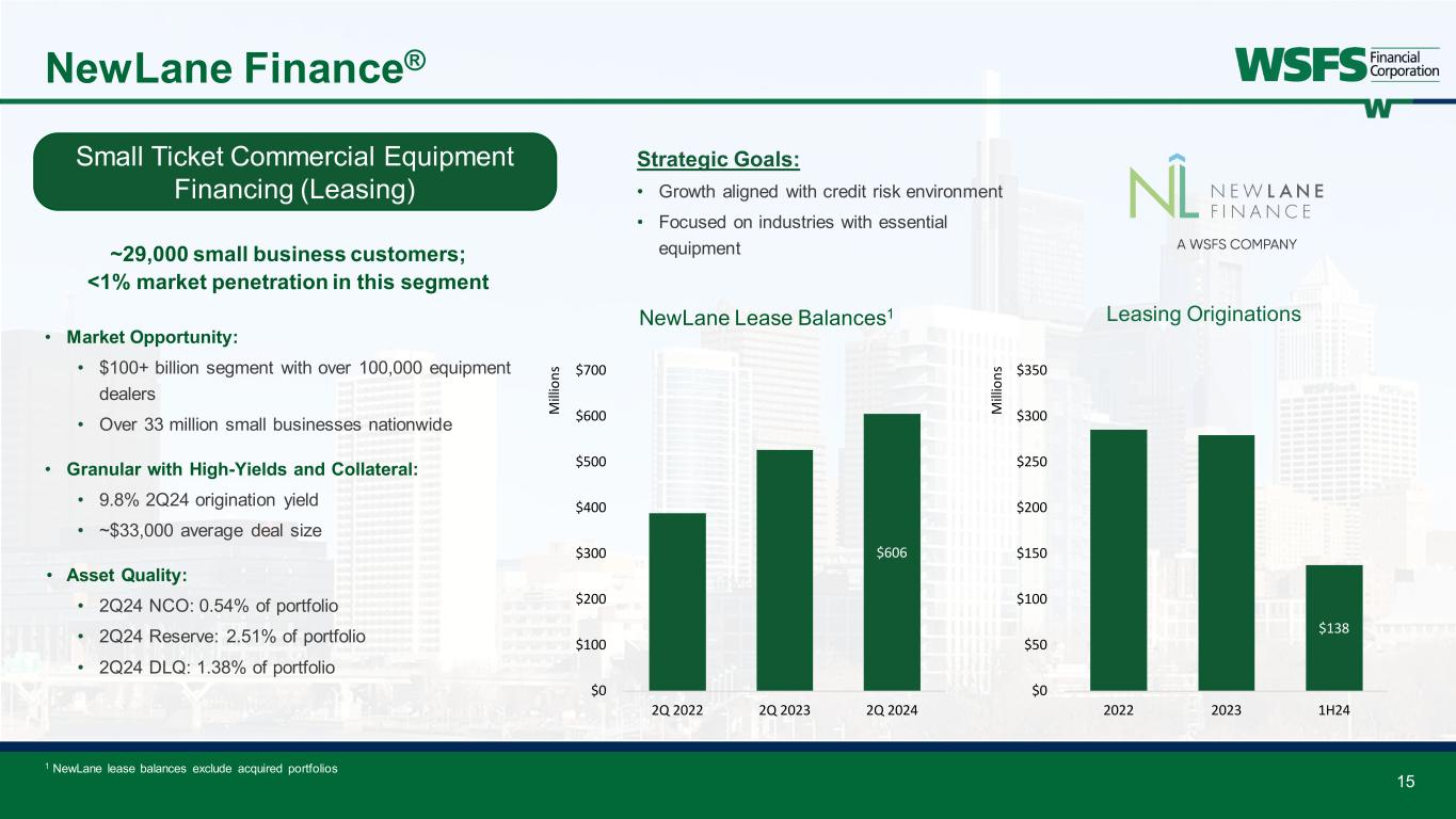 14 Cash Connect® Cash Supported ~$1.7 billion cash managed • Oldest and largest vault cash provider in the ATM industry ATMs ~33,100 non-bank and 579 WSFS • One of the largest networks in footprint • Support over 75 ATM ISOs Smart Safes +710 safes or 8% YTD • Over 9,400 safes (~1,800 Customers) Managed Services Armored Carrier Management: • ~10,000 units Cash Reconcilement & Forecasting: • ~1,000 reconcilement units • ~5,000 forecasting units Loss Protection Fees: • ~17,000 units Leading National Provider of Cash Logistics and Services 33.7 9.4 43.1 0 10 20 30 40 50 2021 2022 2023 1H24 Th ou sa nd s Total Units Managed ATMs Safes Strategic Opportunities: • Double-digit fee revenue growth expected; market share and efficiency gains • Competitively priced product suite along with scale • Improve the Customer experience 0.45% 1.72% 0.00% 0.40% 0.80% 1.20% 1.60% 2.00% 2Q22 4Q22 2Q23 4Q23 2Q24 ROA Trend 1H24 fee revenue of $57.4 million; up 50% compared to 1H23