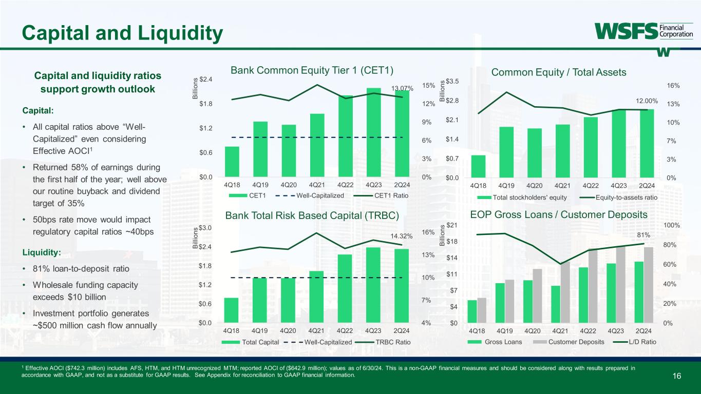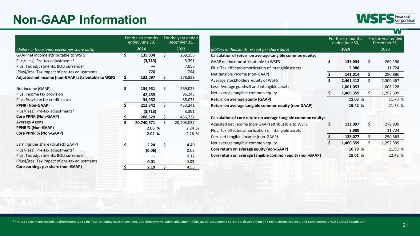 20 Non-GAAP Information For the six months ended June 30, For the year ended December 31, (dollars in thousands) 2024 2023 2023 Net interest income (GAAP) $ 349,727 $ 364,374 $ 725,103 Core net interest income (non-GAAP) $ 349,727 $ 364,374 $ 725,103 Noninterest income (GAAP) $ 167,455 $ 129,998 $ 289,871 (Plus)/less: Unrealized (loss) gain on equity investments, net — (4) 329 Less: Realized gain on sale of equity investment, net 2,130 — 9,493 Less/(plus): Visa derivative valuation adjustment 2,829 (1,105) (2,460) Core fee revenue (non-GAAP) $ 162,496 $ 131,107 $ 282,509 Core net revenue (non-GAAP) $ 512,223 $ 495,481 $ 1,007,612 Core net revenue (non-GAAP) (tax-equivalent) $ 512,984 $ 496,492 $ 1,009,427 Noninterest expense (GAAP) $ 304,840 $ 274,298 $ 561,633 Less: FDIC special assessment 880 — 5,052 Less: Corporate development expense 366 3,536 3,931 Plus: Restructuring expense — (787) (230) Less: Contribution to WSFS CARES Foundation — — 2,000 Core noninterest expense (non-GAAP) $ 303,594 $ 271,549 $ 550,880 Core efficiency ratio (non-GAAP) 59.2 % 54.7 % 54.6 % Core fee revenue ratio (non-GAAP)(tax-equivalent) 31.7 % 26.4 % 28.0 % As of (dollars in thousands) June 30, 2024 Calculation of effective AOCI:​ Unrealized losses on AFS securities ​ $ 549,039 Unrealized losses on securities transferred from AFS to HTM 84,046 Unrecognized fair value on HTM securities 109,186 Effective AOCI (non-GAAP)​ $ 742,271 As of (dollars in thousands, except per share data) June 30, 2024 Total assets (GAAP) $ 20,744,530 Less: Goodwill and other intangible assets 996,181 Total tangible assets (non-GAAP) $ 19,748,349 Total stockholders’ equity of WSFS (GAAP) $ 2,489,580 Less: Goodwill and other intangible assets 996,181 Total tangible common equity (non-GAAP) $ 1,493,399 Number of shares of common stock outstanding (000s) 59,261 Equity to asset ratio (GAAP) 12.00 % Tangible common equity to tangible assets ratio (non-GAAP) 7.56 % Calculation of tangible common book value (TBV) per share excluding AOCI: Total stockholders’ equity of WSFS (GAAP) $ 2,489,580 Total tangible common equity (non-GAAP) $ 1,493,399 Less: AOCI (642,878) Tangible common equity ex-AOCI (non-GAAP) $ 2,136,277 Number of shares of common stock outstanding (000s) 59,261 Book value per share (GAAP) $ 42.01 Tangible common book value per share (non-GAAP) $ 25.20 Tangible common book value per share excluding AOCI (non-GAAP) $ 36.05