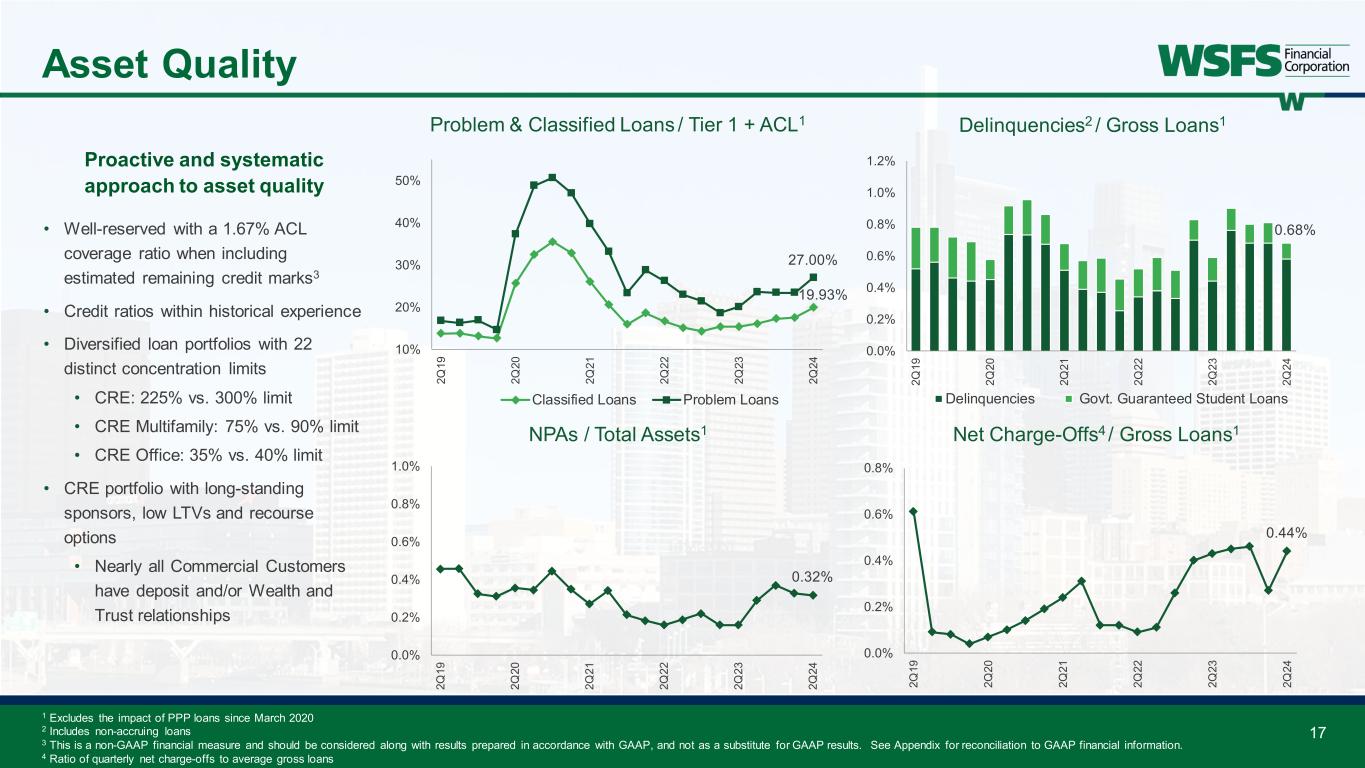 13.07% 0% 3% 6% 9% 12% 15% $0.0 $0.6 $1.2 $1.8 $2.4 4Q18 4Q19 4Q20 4Q21 4Q22 4Q23 2Q24 Bi lli on s CET1 Well-Capitalized CET1 Ratio 16 Capital and Liquidity 81% 0% 20% 40% 60% 80% 100% $0 $4 $7 $11 $14 $18 $21 4Q18 4Q19 4Q20 4Q21 4Q22 4Q23 2Q24 Bi lli on s Gross Loans Customer Deposits L/D Ratio 14.32% 4% 7% 10% 13% 16% $0.0 $0.6 $1.2 $1.8 $2.4 $3.0 4Q18 4Q19 4Q20 4Q21 4Q22 4Q23 2Q24 Bi lli on s Total Capital Well-Capitalized TRBC Ratio 12.00% 0% 3% 7% 10% 13% 16% $0.0 $0.7 $1.4 $2.1 $2.8 $3.5 4Q18 4Q19 4Q20 4Q21 4Q22 4Q23 2Q24 Bi lli on s Total stockholders' equity Equity-to-assets ratio EOP Gross Loans / Customer Deposits Bank Common Equity Tier 1 (CET1) Common Equity / Total Assets Bank Total Risk Based Capital (TRBC) Capital and liquidity ratios support growth outlook Capital: • All capital ratios above “Well- Capitalized” even considering Effective AOCI1 • Returned 58% of earnings during the first half of the year; well above our routine buyback and dividend target of 35% • 50bps rate move would impact regulatory capital ratios ~40bps Liquidity: • 81% loan-to-deposit ratio • Wholesale funding capacity exceeds $10 billion • Investment portfolio generates ~$500 million cash flow annually 1 Effective AOCI ($742.3 million) includes AFS, HTM, and HTM unrecognized MTM; reported AOCI of ($642.9 million); values as of 6/30/24. This is a non-GAAP financial measures and should be considered along with results prepared in accordance with GAAP, and not as a substitute for GAAP results. See Appendix for reconciliation to GAAP financial information.