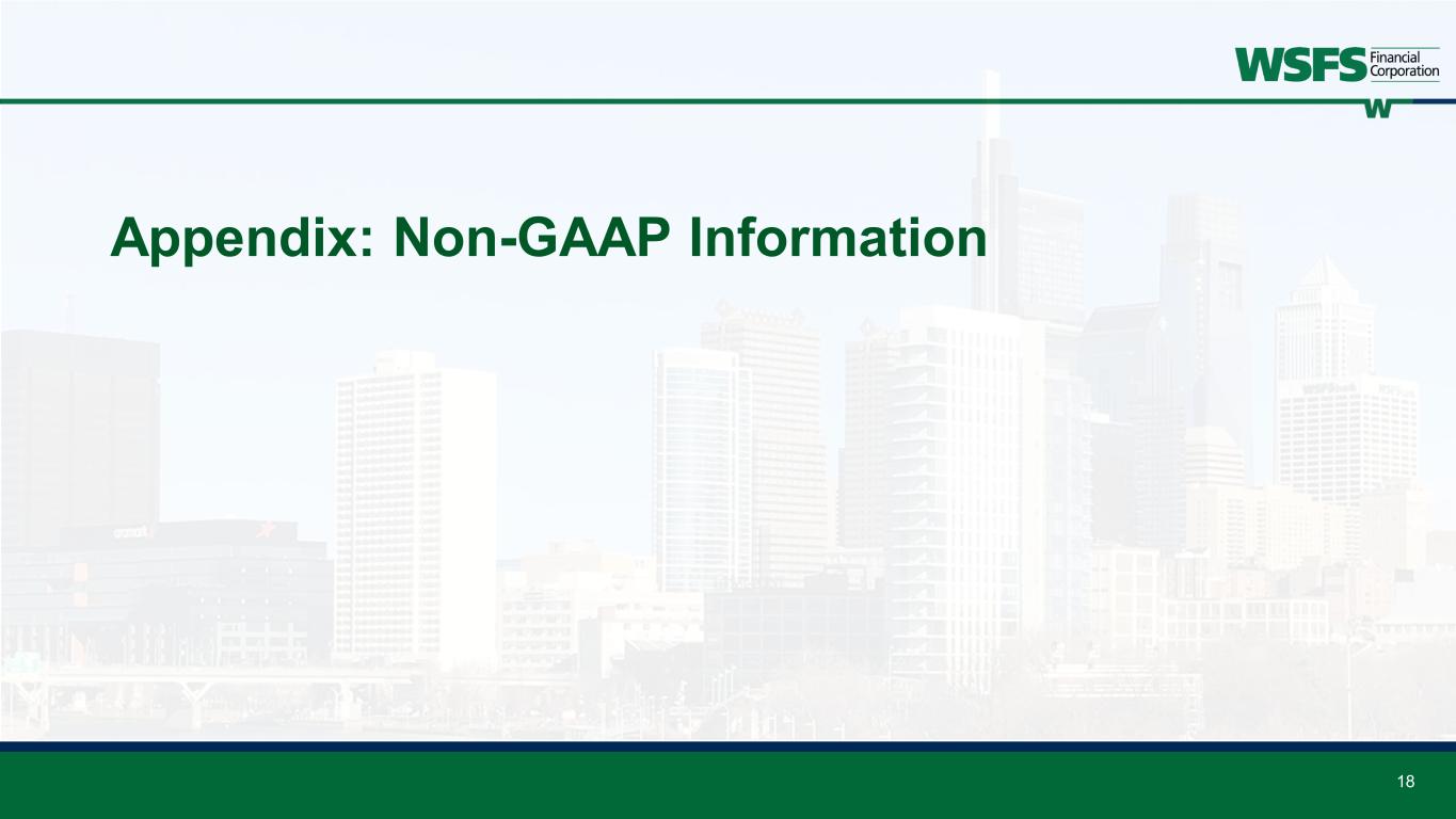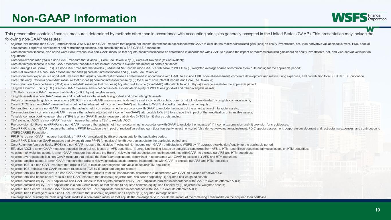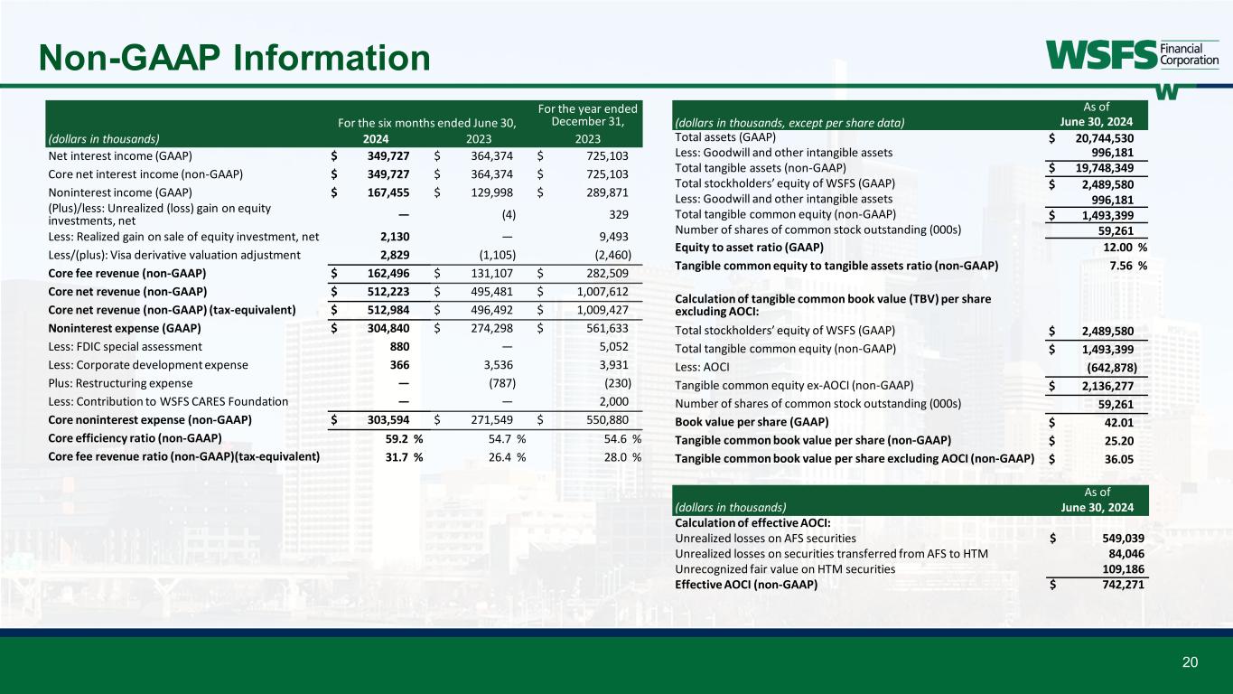 19 Non-GAAP Information This presentation contains financial measures determined by methods other than in accordance with accounting principles generally accepted in the United States (GAAP). This presentation may include the following non-GAAP measures: • Adjusted Net Income (non-GAAP) attributable to WSFS is a non-GAAP measure that adjusts net income determined in accordance with GAAP to exclude the realized/unrealized gain (loss) on equity investments, net, Visa derivative valuation adjustment, FDIC special assessment, corporate development and restructuring expense, and contribution to WSFS CARES Foundation; • Core noninterest income, also called Core Fee Revenue, is a non-GAAP measure that adjusts noninterest income as determined in accordance with GAAP to exclude the impact of realized/unrealized gain (loss) on equity investments, net, and Visa derivative valuation adjustment; • Core fee revenue ratio (%) is a non-GAAP measure that divides (i) Core Fee Revenue by (ii) Core Net Revenue (tax-equivalent); • Core net interest income is a non-GAAP measure that adjusts net interest income to exclude the impact of certain dividends; • Core Earnings Per Share (EPS) is a non-GAAP measure that divides (i) Adjusted Net Income (non-GAAP) attributable to WSFS by (ii) weighted average shares of common stock outstanding for the applicable period; • Core Net Revenue is a non-GAAP measure that adds (i) core net interest income and (ii) Core Fee Revenue; • Core noninterest expense is a non-GAAP measure that adjusts noninterest expense as determined in accordance with GAAP to exclude FDIC special assessment, corporate development and restructuring expenses, and contribution to WSFS CARES Foundation; • Core Efficiency Ratio is a non-GAAP measure that divides (i) core noninterest expense by (ii) the sum of core interest income and Core Fee Revenue; • Core Return on Average Assets (ROA) is a non-GAAP measure that divides (i) Adjusted Net Income (non-GAAP) attributable to WSFS by (ii) average assets for the applicable period; • Tangible Common Equity (TCE) is a non-GAAP measure and is defined as total stockholders’ equity of WSFS less goodwill and other intangible assets; • TCE Ratio is a non-GAAP measure that divides (i) TCE by (ii) tangible assets; • Tangible assets is a non-GAAP measure and is defined as total assets less goodwill and other intangible assets; • Return on average tangible common equity (ROTCE) is a non-GAAP measure and is defined as net income allocable to common stockholders divided by tangible common equity; • Core ROTCE is a non-GAAP measure that is defined as adjusted net income (non-GAAP) attributable to WSFS divided by tangible common equity; • Net tangible income is a non-GAAP measure that adjusts net income determined in accordance with GAAP to exclude the impact of the amortization of intangible assets; • Core net tangible income is a non-GAAP measure that adjusts adjusted net income (non-GAAP) attributable to WSFS to exclude the impact of the amortization of intangible assets; • Tangible common book value per share (TBV) is a non-GAAP financial measure that divides (i) TCE by (ii) shares outstanding; • TBV excluding AOCI is a non-GAAP financial measure that adjusts TBV to exclude AOCI; • Pre-provision Net Revenue (PPNR) is a non-GAAP measure that adjusts net income determined in accordance with GAAP to exclude the impacts of (i) income tax provision and (ii) provision for credit losses; • Core PPNR is a non-GAAP measure that adjusts PPNR to exclude the impact of realized/unrealized gain (loss) on equity investments, net, Visa derivative valuation adjustment, FDIC special assessment, corporate development and restructuring expenses, and contribution to WSFS CARES Foundation; • PPNR % is a non-GAAP measure that divides (i) PPNR (annualized) by (ii) average assets for the applicable period; • Core PPNR % is a non-GAAP measure that divides (i) core PPNR (annualized) by (ii) average assets for the applicable period; and • Core Return on Average Equity (ROE) is a non-GAAP measure that divides (i) Adjusted Net Income (non-GAAP) attributable to WSFS by (ii) average stockholders’ equity for the applicable period. • Effective AOCI is a non-GAAP measure that adds (i) unrealized losses on AFS securities, (ii) unrealized holding losses on securities transferred from AFS to HTM, and (iii) unrecognized fair value losses on HTM securities; • Adjusted risk weighted assets is a non-GAAP measure that adjusts the Bank’s risk weighted assets determined in accordance with GAAP to exclude our AFS and HTM securities; • Adjusted average assets is a non-GAAP measure that adjusts the Bank’s average assets determined in accordance with GAAP to exclude our AFS and HTM securities; • Adjusted tangible assets is a non-GAAP measure that adjusts risk weighted assets determined in accordance with GAAP to exclude our AFS and HTM securities ; • Adjusted TCE is a non-GAAP measure that adjusts TCE to exclude unrecognized fair value losses on HTM securities; • Adjusted TCE ratio is a non-GAAP measure (i) adjusted TCE by (ii) adjusted tangible assets; • Adjusted total risk-based capital is a non-GAAP measure that adjusts total risk-based capital determined in accordance with GAAP to exclude effective AOCI; • Adjusted total risk-based capital ratio is a non-GAAP measure that divides (i) adjusted total risk-based capital by (ii) adjusted risk weighted assets; • Adjusted common equity Tier 1 capital is a non-GAAP measure that adjusts common equity Tier 1 capital determined in accordance with GAAP to exclude effective AOCI; • Adjusted common equity Tier 1 capital ratio is a non-GAAP measure that divides (i) adjusted common equity Tier 1 capital by (ii) adjusted risk weighted assets; • Adjusted Tier 1 capital is a non-GAAP measure that adjusts Tier 1 capital determined in accordance with GAAP to exclude effective AOCI; • Adjusted Tier 1 leverag