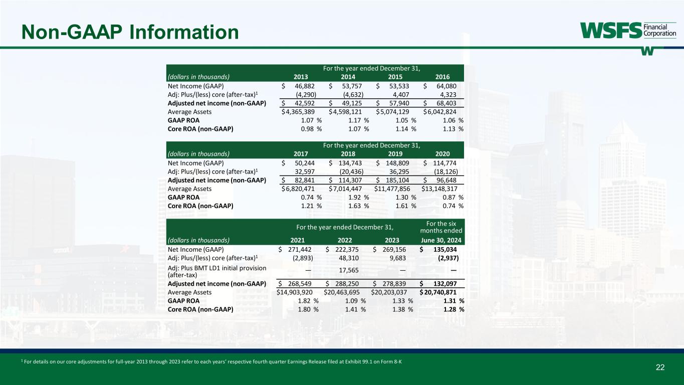 21 Non-GAAP Information 1 Pre-tax adjustments include realized/unrealized gain (loss) on equity investments, net, Visa derivative valuation adjustment, FDIC special assessment, corporate development and restructuring expense, and contribution to WSFS CARES Foundation. For the six months ended June 30, For the year ended December 31, (dollars in thousands, except per share data) 2024 2023 GAAP net income attributable to WSFS $ 135,034 $ 269,156 Plus/(less): Pre-tax adjustments1 (3,713) 3,391 Plus: Tax adjustments: BOLI surrender — 7,056 (Plus)/less: Tax impact of pre-tax adjustments 776 (764) Adjusted net income (non-GAAP) attributable to WSFS $ 132,097 $ 278,839 Net income (GAAP) $ 134,931 $ 269,025 Plus: Income tax provision 42,459 96,245 Plus: Provision for credit losses 34,952 88,071 PPNR (Non-GAAP) $ 212,342 $ 453,341 Plus/(less): Pre-tax adjustments1 (3,713) 3,391 Core PPNR (Non-GAAP) $ 208,629 $ 456,732 Average Assets $ 20,740,871 $ 20,203,037 PPNR % (Non-GAAP) 2.06 % 2.24 % Core PPNR % (Non-GAAP) 2.02 % 2.26 % Earnings per share (diluted)(GAAP) $ 2.24 $ 4.40 Plus/(less): Pre-tax adjustments1 (0.06) 0.05 Plus: Tax adjustments: BOLI surrender — 0.12 (Plus)/less: Tax impact of pre-tax adjustments 0.01 (0.02) Core earnings per share (non-GAAP) $ 2.19 $ 4.55 For the six months ended June 30, For the year ended December 31, (dollars in thousands, except per share data) 2024 2023 Calculation of return on average tangible common equity:​ GAAP net income attributable to WSFS​ $ 135,034 $ 269,156 Plus: Tax effected amortization of intangible assets​ 5,980 11,724 Net tangible income (non-GAAP)​ $ 141,014 $ 280,880 Average stockholders' equity of WSFS​ $ 2,461,412 $ 2,300,467 Less: Average goodwill and intangible assets​ 1,001,053 1,008,128 Net average tangible common equity​ $ 1,460,359 $ 1,292,339 Return on average equity (GAAP)​ 11.03 % 11.70 % Return on average tangible common equity (non-GAAP)​ 19.42 % 21.73 % Calculation of core return on average tangible common equity:​ Adjusted net income (non-GAAP) attributable to WSFS​ $ 132,097 $ 278,839 Plus: Tax effected amortization of intangible assets​ 5,980 11,724 Core net tangible income (non-GAAP)​ $ 138,077 $ 290,563 Net average tangible common equity​ $ 1,460,359 $ 1,292,339 Core return on average equity (non-GAAP)​ 10.79 % 21.58 % Core return on average tangible common equity (non-GAAP)​ 19.01 % 22.48 %