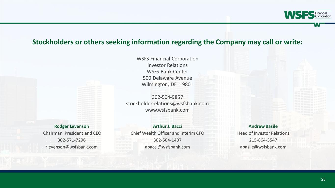 23 Stockholders or others seeking information regarding the Company may call or write: WSFS Financial Corporation Investor Relations WSFS Bank Center 500 Delaware Avenue Wilmington, DE 19801 302-504-9857 stockholderrelations@wsfsbank.com www.wsfsbank.com Rodger Levenson Chairman, President and CEO 302-571-7296 rlevenson@wsfsbank.com Arthur J. Bacci Chief Wealth Officer and Interim CFO 302-504-1407 abacci@wsfsbank.com Andrew Basile Head of Investor Relations 215-864-3547 abasile@wsfsbank.com