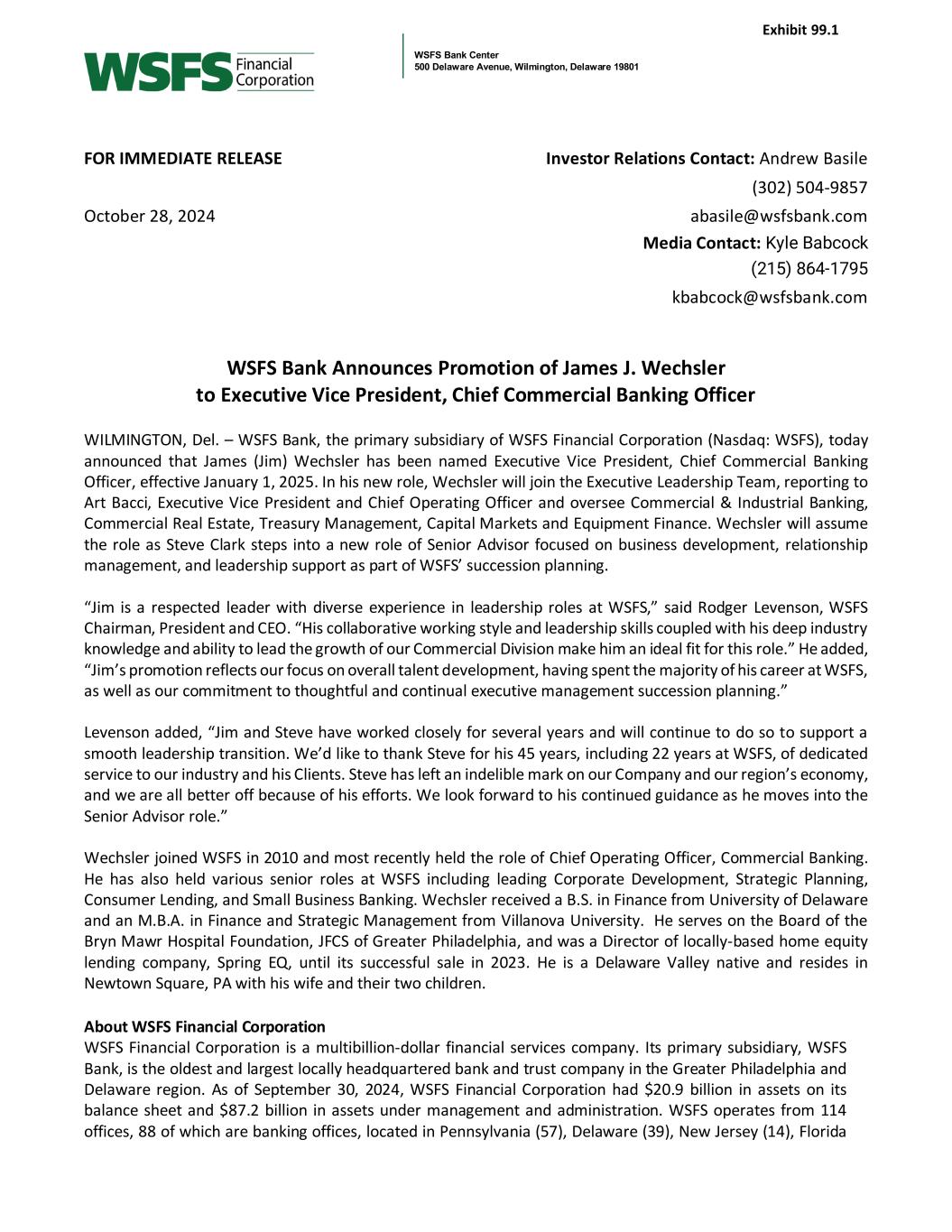 WSFS Bank Center 500 Delaware Avenue, Wilmington, Delaware 19801 FOR IMMEDIATE RELEASE Investor Relations Contact: Andrew Basile (302) 504-9857 October 28, 2024 abasile@wsfsbank.com Media Contact: Kyle Babcock (215) 864-1795 kbabcock@wsfsbank.com WSFS Bank Announces Promotion of James J. Wechsler to Executive Vice President, Chief Commercial Banking Officer WILMINGTON, Del. – WSFS Bank, the primary subsidiary of WSFS Financial Corporation (Nasdaq: WSFS), today announced that James (Jim) Wechsler has been named Executive Vice President, Chief Commercial Banking Officer, effective January 1, 2025. In his new role, Wechsler will join the Executive Leadership Team, reporting to Art Bacci, Executive Vice President and Chief Operating Officer and oversee Commercial & Industrial Banking, Commercial Real Estate, Treasury Management, Capital Markets and Equipment Finance. Wechsler will assume the role as Steve Clark steps into a new role of Senior Advisor focused on business development, relationship management, and leadership support as part of WSFS’ succession planning. “Jim is a respected leader with diverse experience in leadership roles at WSFS,” said Rodger Levenson, WSFS Chairman, President and CEO. “His collaborative working style and leadership skills coupled with his deep industry knowledge and ability to lead the growth of our Commercial Division make him an ideal fit for this role.” He added, “Jim’s promotion reflects our focus on overall talent development, having spent the majority of his career at WSFS, as well as our commitment to thoughtful and continual executive management succession planning.” Levenson added, “Jim and Steve have worked closely for several years and will continue to do so to support a smooth leadership transition. We’d like to thank Steve for his 45 years, including 22 years at WSFS, of dedicated service to our industry and his Clients. Steve has left an indelible mark on our Company and our region’s economy, and we are all better off because of his efforts. We look forward to his continued guidance as he moves into the Senior Advisor role.” Wechsler joined WSFS in 2010 and most recently held the role of Chief Operating Officer, Commercial Banking. He has also held various senior roles at WSFS including leading Corporate Development, Strategic Planning, Consumer Lending, and Small Business Banking. Wechsler received a B.S. in Finance from University of Delaware and an M.B.A. in Finance and Strategic Management from Villanova University. He serves on the Board of the Bryn Mawr Hospital Foundation, JFCS of Greater Philadelphia, and was a Director of locally-based home equity lending company, Spring EQ, until its successful sale in 2023. He is a Delaware Valley native and resides in Newtown Square, PA with his wife and their two children. About WSFS Financial Corporation WSFS Financial Corporation is a multibillion-dollar financial services company. Its primary subsidiary, WSFS Bank, is the oldest and largest locally headquartered bank and trust company in the Greater Philadelphia and Delaware region. As of September 30, 2024, WSFS Financial Corporation had $20.9 billion in assets on its balance sheet and $87.2 billion in assets under management and administration. WSFS operates from 114 offices, 88 of which are banking offices, located in Pennsylvania (57), Delaware (39), New Jersey (14), Florida Exhibit 99.1
