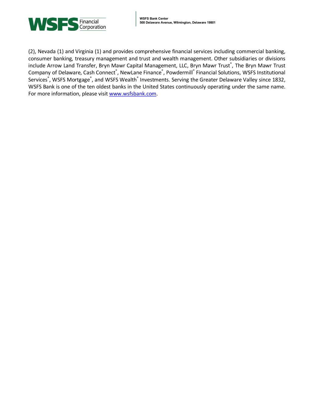 WSFS Bank Center 500 Delaware Avenue, Wilmington, Delaware 19801 (2), Nevada (1) and Virginia (1) and provides comprehensive financial services including commercial banking, consumer banking, treasury management and trust and wealth management. Other subsidiaries or divisions include Arrow Land Transfer, Bryn Mawr Capital Management, LLC, Bryn Mawr Trust®, The Bryn Mawr Trust Company of Delaware, Cash Connect®, NewLane Finance®, Powdermill® Financial Solutions, WSFS Institutional Services®, WSFS Mortgage®, and WSFS Wealth® Investments. Serving the Greater Delaware Valley since 1832, WSFS Bank is one of the ten oldest banks in the United States continuously operating under the same name. For more information, please visit www.wsfsbank.com.