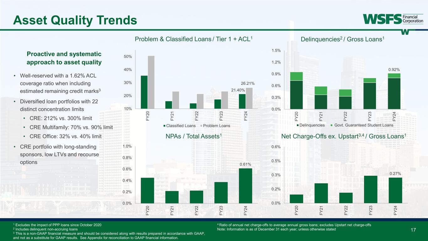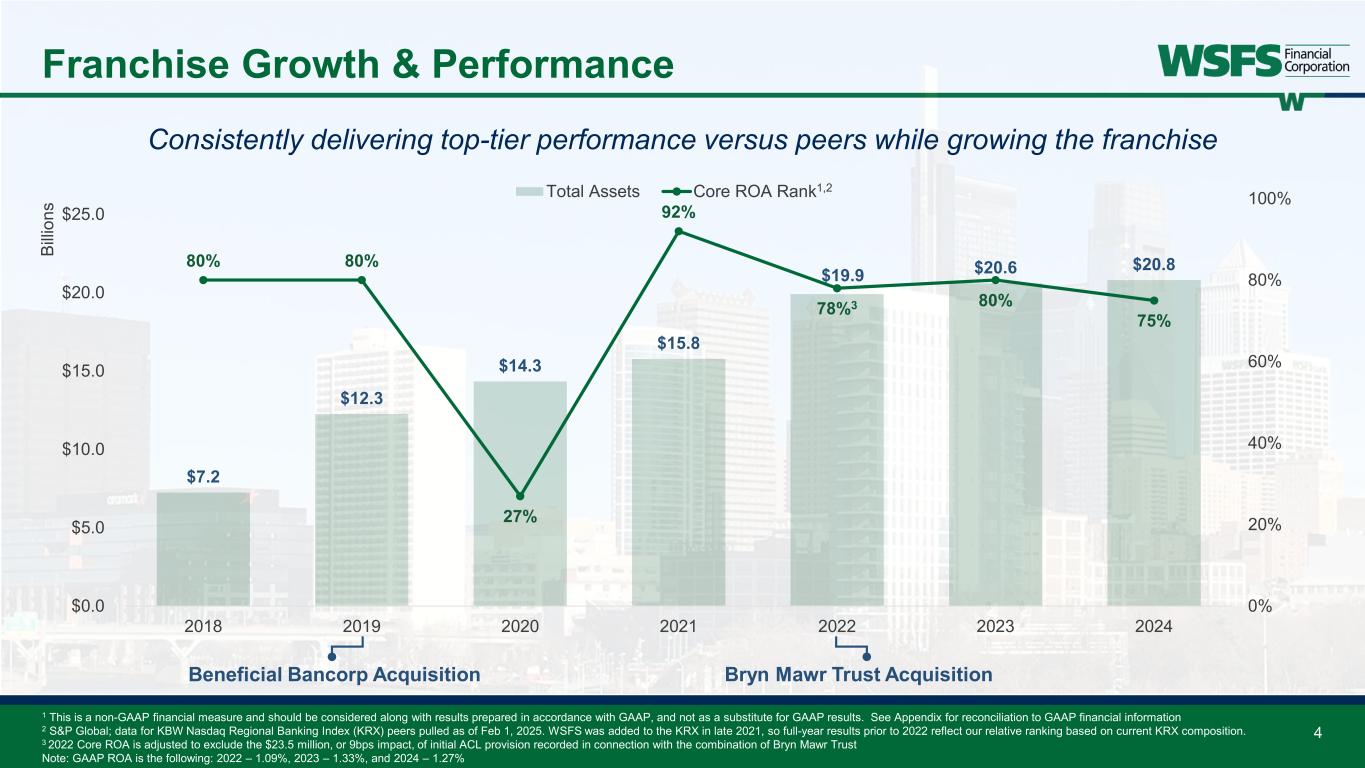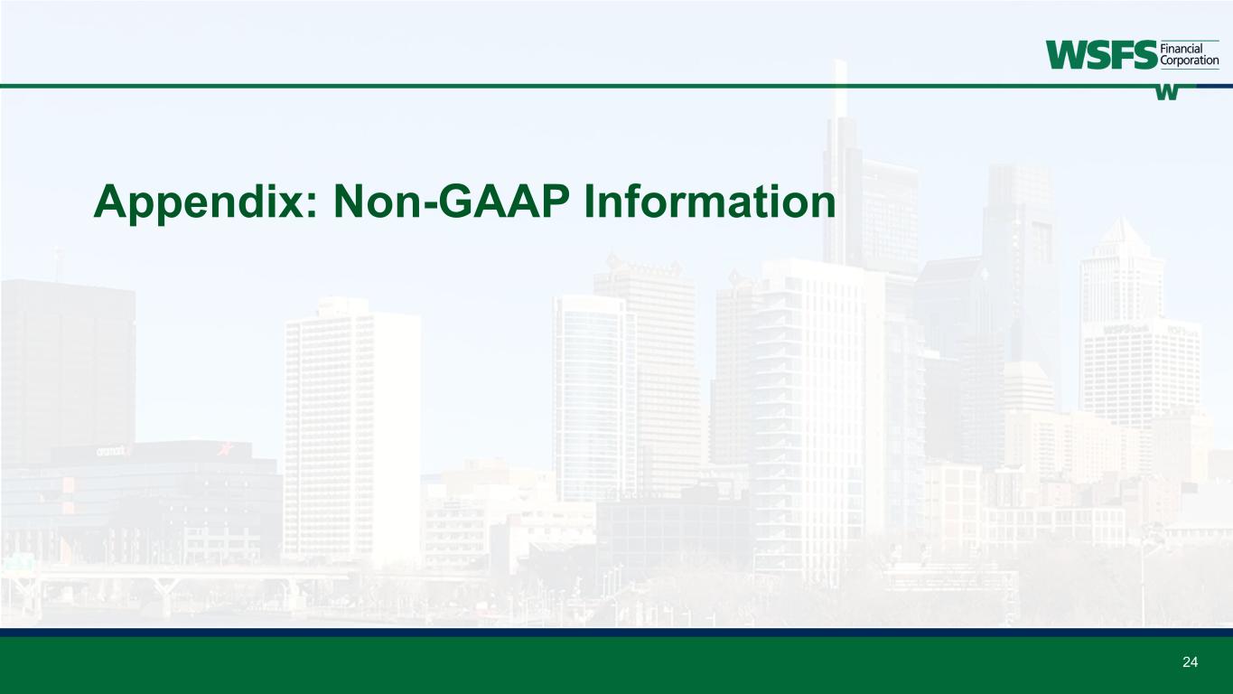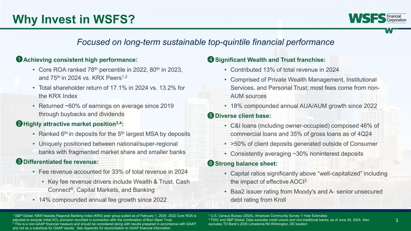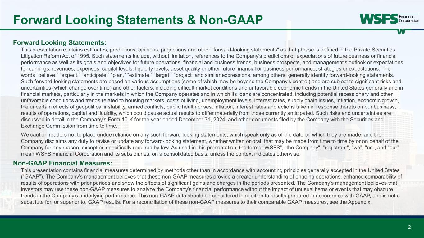 Forward Looking Statements & Non-GAAP Forward Looking Statements: This presentation contains estimates, predictions, opinions, projections and other "forward-looking statements" as that phrase is defined in the Private Securities Litigation Reform Act of 1995. Such statements include, without limitation, references to the Company's predictions or expectations of future business or financial performance as well as its goals and objectives for future operations, financial and business trends, business prospects, and management's outlook or expectations for earnings, revenues, expenses, capital levels, liquidity levels, asset quality or other future financial or business performance, strategies or expectations. The words “believe,” “expect,” “anticipate,” “plan,” “estimate,” “target,” “project” and similar expressions, among others, generally identify forward-looking statements. Such forward-looking statements are based on various assumptions (some of which may be beyond the Company's control) and are subject to significant risks and uncertainties (which change over time) and other factors, including difficult market conditions and unfavorable economic trends in the United States generally and in financial markets, particularly in the markets in which the Company operates and in which its loans are concentrated, including potential recessionary and other unfavorable conditions and trends related to housing markets, costs of living, unemployment levels, interest rates, supply chain issues, inflation, economic growth, the uncertain effects of geopolitical instability, armed conflicts, public health crises, inflation, interest rates and actions taken in response thereto on our business, results of operations, capital and liquidity, which could cause actual results to differ materially from those currently anticipated. Such risks and uncertainties are discussed in detail in the Company’s Form 10-K for the year ended December 31, 2024, and other documents filed by the Company with the Securities and Exchange Commission from time to time. We caution readers not to place undue reliance on any such forward-looking statements, which speak only as of the date on which they are made, and the Company disclaims any duty to revise or update any forward-looking statement, whether written or oral, that may be made from time to time by or on behalf of the Company for any reason, except as specifically required by law. As used in this presentation, the terms "WSFS", "the Company", "registrant", "we", "us", and "our" mean WSFS Financial Corporation and its subsidiaries, on a consolidated basis, unless the context indicates otherwise. Non-GAAP Financial Measures: This presentation contains financial measures determined by methods other than in accordance with accounting principles generally accepted in the United States (“GAAP”). The Company’s management believes that these non-GAAP measures provide a greater understanding of ongoing operations, enhance comparability of results of operations with prior periods and show the effects of significant gains and charges in the periods presented. The Company’s management believes that investors may use these non-GAAP measures to analyze the Company’s financial performance without the impact of unusual items or events that may obscure trends in the Company’s underlying performance. This non-GAAP data should be considered in addition to results prepared in accordance with GAAP, and is not a substitute for, or superior to, GAAP results. For a reconciliation of these non-GAAP measures to their comparable GAAP measures, see the Appendix. 2