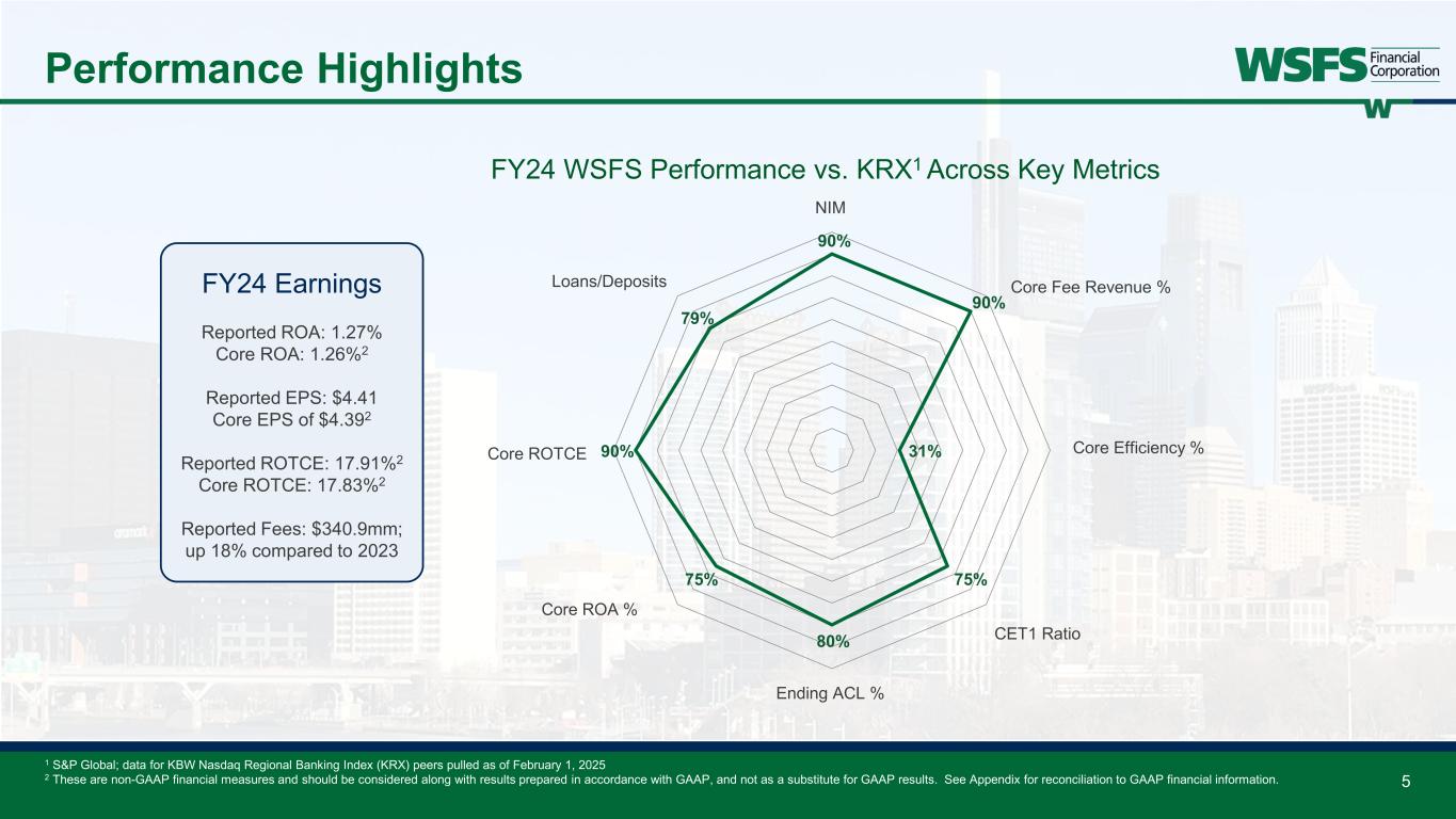 Consistently delivering top-tier performance versus peers while growing the franchise 4 Franchise Growth & Performance $7.2 $12.3 $14.3 $15.8 $19.9 $20.6 $20.880% 80% 27% 92% 78%3 80% 75% 0% 20% 40% 60% 80% 100% $0.0 $5.0 $10.0 $15.0 $20.0 $25.0 2018 2019 2020 2021 2022 2023 2024 Bi llio ns Total Assets Core ROA Rank 1 This is a non-GAAP financial measure and should be considered along with results prepared in accordance with GAAP, and not as a substitute for GAAP results. See Appendix for reconciliation to GAAP financial information 2 S&P Global; data for KBW Nasdaq Regional Banking Index (KRX) peers pulled as of Feb 1, 2025. WSFS was added to the KRX in late 2021, so full-year results prior to 2022 reflect our relative ranking based on current KRX composition. 3 2022 Core ROA is adjusted to exclude the $23.5 million, or 9bps impact, of initial ACL provision recorded in connection with the combination of Bryn Mawr Trust Note: GAAP ROA is the following: 2022 – 1.09%, 2023 – 1.33%, and 2024 – 1.27% Beneficial Bancorp Acquisition Bryn Mawr Trust Acquisition 1,2