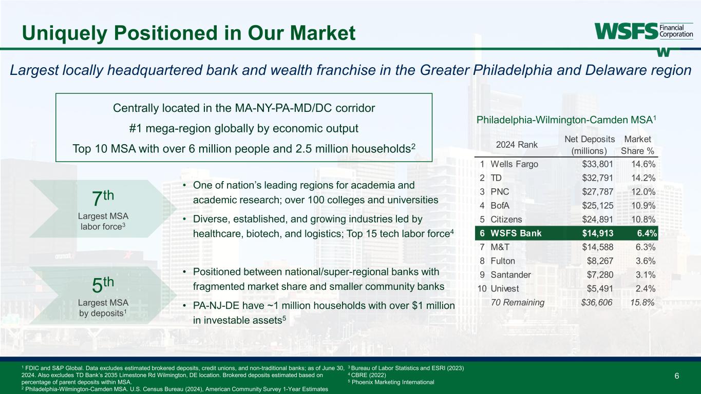 5 Performance Highlights 1 S&P Global; data for KBW Nasdaq Regional Banking Index (KRX) peers pulled as of February 1, 2025 2 These are non-GAAP financial measures and should be considered along with results prepared in accordance with GAAP, and not as a substitute for GAAP results. See Appendix for reconciliation to GAAP financial information. NIM Core Fee Revenue % Core Efficiency % CET1 Ratio Ending ACL % Core ROA % Core ROTCE Loans/Deposits FY24 WSFS Performance vs. KRX1 Across Key Metrics 90% 90% 90% 75% 80% 75% 31% 79% FY24 Earnings Reported ROA: 1.27% Core ROA: 1.26%2 Reported EPS: $4.41 Core EPS of $4.392 Reported ROTCE: 17.91%2 Core ROTCE: 17.83%2 Reported Fees: $340.9mm; up 18% compared to 2023