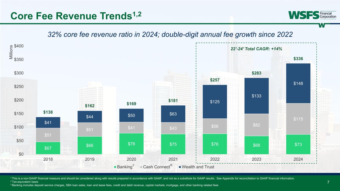 Significant Wealth and Trust franchise: • Contributed 13% of total revenue in 2024 • Comprised of Private Wealth Management, Institutional Services, and Personal Trust; most fees come from non- AUM sources • 18% compounded annual AUA/AUM growth since 2022 Diverse client base: • C&I loans (including owner-occupied) composed 46% of commercial loans and 35% of gross loans as of 4Q24 • >50% of client deposits generated outside of Consumer • Consistently averaging ~30% noninterest deposits Strong balance sheet: • Capital ratios significantly above “well-capitalized” including the impact of effective AOCI2 • Baa2 issuer rating from Moody's and A- senior unsecured debt rating from Kroll Achieving consistent high performance: • Core ROA ranked 78th percentile in 2022, 80th in 2023, and 75th in 2024 vs. KRX Peers1,2 • Total shareholder return of 17.1% in 2024 vs. 13.2% for the KRX Index • Returned ~60% of earnings on average since 2019 through buybacks and dividends Highly attractive market position3,4: • Ranked 6th in deposits for the 5th largest MSA by deposits • Uniquely positioned between national/super-regional banks with fragmented market share and smaller banks Differentiated fee revenue: • Fee revenue accounted for 33% of total revenue in 2024 • Key fee revenue drivers include Wealth & Trust, Cash Connect®, Capital Markets, and Banking • 14% compounded annual fee growth since 2022 Focused on long-term sustainable top-quintile financial performance 3 Why Invest in WSFS? 1 2 3 4 5 1 S&P Global; KBW Nasdaq Regional Banking Index (KRX) peer group pulled as of February 1, 2025. 2022 Core ROA is adjusted to exclude initial ACL provision recorded in connection with the combination of Bryn Mawr Trust. 2 This is a non-GAAP financial measure and should be considered along with results prepared in accordance with GAAP, and not as a substitute for GAAP results. See Appendix for reconciliation to GAAP financial information. 3 U.S. Census Bureau (2024), American Community Survey 1-Year Estimates 4 FDIC and S&P Global. Data excludes credit unions and non-traditional banks; as of June 30, 2024. Also excludes TD Bank’s 2035 Limestone Rd Wilmington, DE location 6