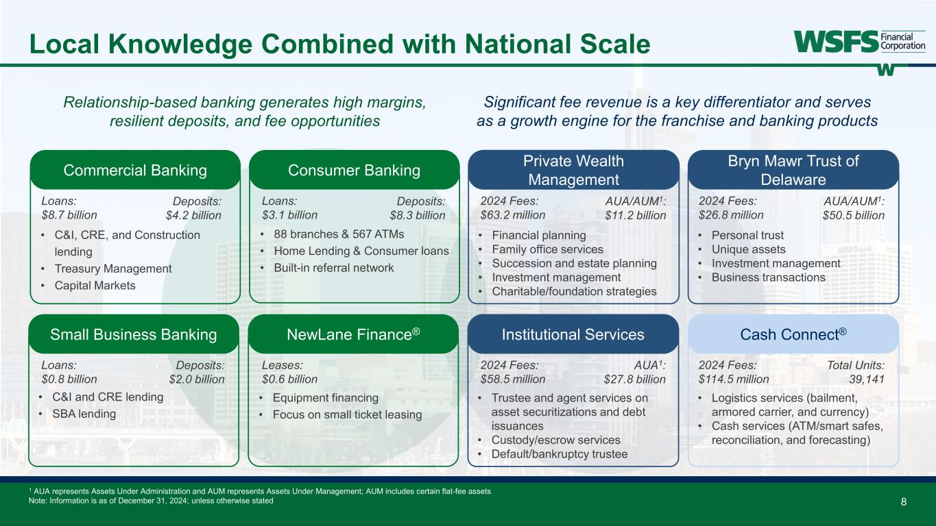 7 Core Fee Revenue Trends1,2 1 This is a non-GAAP financial measure and should be considered along with results prepared in accordance with GAAP, and not as a substitute for GAAP results. See Appendix for reconciliation to GAAP financial information. 2 Tax-equivalent basis 3 Banking includes deposit service charges, SBA loan sales, loan and lease fees, credit and debit revenue, capital markets, mortgage, and other banking related fees 32% core fee revenue ratio in 2024; double-digit annual fee growth since 2022 $67 $66 $78 $75 $76 $68 $73 $51 $51 $41 $43 $56 $82 $115 $41 $44 $50 $63 $125 $133 $148 $138 $162 $169 $181 $257 $283 $336 $0 $50 $100 $150 $200 $250 $300 $350 $400 2018 2019 2020 2021 2022 2023 2024 M illi on s Banking Cash Connect Wealth and Trust 22’-24’ Total CAGR: +14% 3 ®